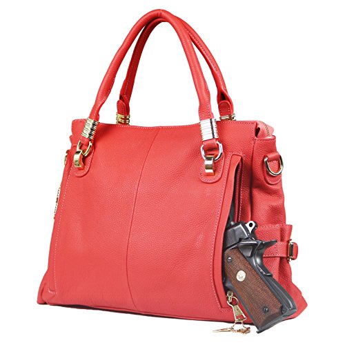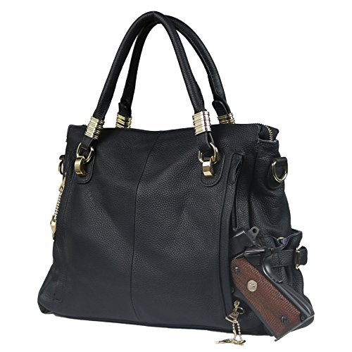 -. Feature : SUPPLE, PEBBLED 100% GENUINE LEATHER - Adorned with brass fittings and buckled gathered pockets/branded with a signature Lady Conceal emblem / SPACIOUS INTERIOR - Top zippered access / Fully lined 100% polyester / Zippered center divider / Two open slip pockets and a zippered P.R.Ivacy pocket / Interior leather lanyard with brass swivel snap for keys / DUAL CARRING STRAPS/HANDLES - Round handles measure 15" long with 4-1/2" drop / Optional cross body adjustable strap measures 25"- 46" by 1-1/8" (drop 12" - 24") / Quality, solid brass hardware / LOCKING AMBIDEXTROUS CONCEALMENT POCKET - Access to gun pocket on both ends / Locking concealment zippers with 4 keys / Includes universal elastic, nylon holster / Concealment pocket measures 6" tall x 9" wide / IDEAL SIZE - Dimensions: 10.5" tall x 14" wide x 2-1/2 (top) 5" (bottom)" deep