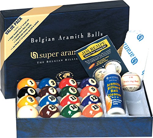 Aramith Professional Series billiard balls are crafted from the highest quality phenolic resin, providing exceptional scratch and impact resistance. Phenolic resin is proven to last up-to 5 times longer than balls made of polymers or polyester. Each ball is regulations size, measuring 2-1/4" in diameter and features the classic "numbers in the stripe" design. This complete set of 16 balls includes 8 solids, 7 stripes and a cue ball. This Pro Advantage Value Pack contains a bottle of Aramith ball cleaner and a microfiber cloth to keep your billiard balls polished and lustrous for years to come. Also included is the Armith 2-1/4" regulation size training cue ball that was developed by American Professional Pocket Billiards player Jim Rempe, who was inducted into the BCA Hall of Fame. The Jim Rempe training cue ball is marked with rings and targets on the surface of the ball, allowing you to practice judging the effects of very particular amounts of sidespin, topspin, backspin and other forms of cue ball control. Intended to help players of all skill levels improve their game; one side of the cue ball is designed for beginners, and the opposite side provides instruction for advanced players. Also included is a 56 page instruction manual which provides instruction on how to properly use the training patterns and offers additional tips and tricks to help you learn to control your cue stroke. Aramith billiard balls adhere to the most stringent specifications in the industry, ensuring superior playability and durability. They are constructed with perfect roundness and balance, uniform weight and hardness, brilliant colors and a friction resistant roll. Aramith Professional Series billiard balls are the preferred balls used in tournaments and championships worldwide.