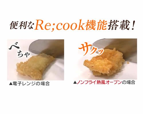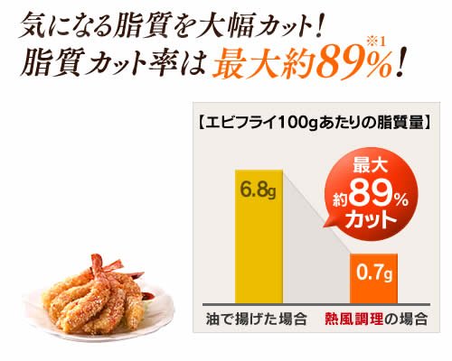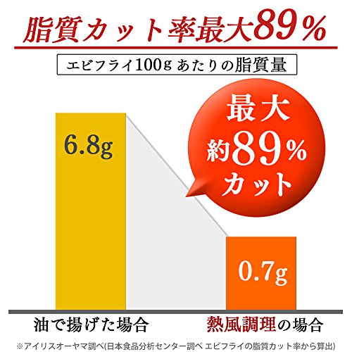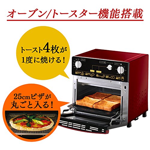 ■油で揚げずにヘルシーでおいしいフライが簡単に作れる。■フライヤー/リクック:シーズヒーター×1■オーブン/トースター:石英管ヒーター×4(上下各2)■タイマー:電源スイッチ兼用30分(ベル音付き)■本体:幅約34.1×奥行き約32.5×高さ約34.8(cm)■フライヤー/リクック:幅約22×奥行約22×高さ約7(cm)■オーブン/トースター:幅約25×奥行約25×高さ約8(cm)■重量:約9.8kg■消費電力:1410W■電源:AC100V(50/60Hz共通)■コード長さ:約1.2m■付属品:フライ受け皿、フライ用網、オイルスプレー、焼き網、オリジナルレシピブック