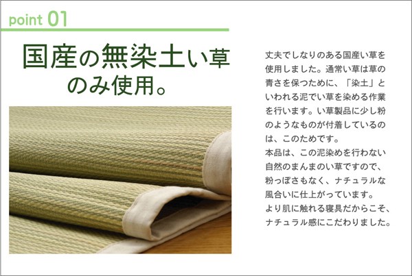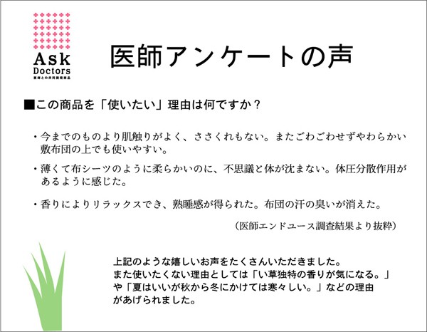 医師60名の意見・アイデアから快適な睡眠をサポートする「い草寝具シリーズ」を共同開発しました。長時間、肌に接する寝具だからこそ、自然素材を使い、やわらかな質感にこだわりました。快眠い草の効能として1.綿の約3倍の吸湿力 2.蒸れにくい。汗による湿気を吸うことにより温度を下げ快適な就寝を促します。 3.汗のにおいを軽減。汗のにおいの元となる化学物質を90%以上抑えます。などがあります。染料、染土を使わない国産(九州産)のしなやかなイ草を使用していますので、柔らかく、すべすべとしており身体にフィットします。い草に青森ヒバ加工を施しています。(抗菌、防臭効果)