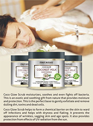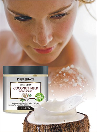 -. Feature : BODY POLISH SCRUB: Coconut Milk Body Scrub is an exotic and soothing gift from nature that provides moisture and protection. Made with Coconut, a touch of 6 essential oils abundant with vitamins A, B and E and full of fatty acids to rejuvenate and exfoliate your skin. This Invigorating body scrub is the perfect base to gently exfoliate and remove dulling dirt, toxins and dead cells. Natural antioxidants work together to make skin look young and healthy. Gentle enough for everyday use. / BENEFITS: The regular use of the scrub helps to form a chemical barrier on the skin to ward off infection & reduce the symp of psoriasis, eczema, and dermatitis. It supports the natural chemical balance of the skin & softens skin and helps relieve dryness and flaking. This anti aging scrub prevents the appearance of wrinkles, sagging skin and age spots. It promotes healthy looking complexion & provides protection from effects of UV radiation from the sun. / BODY SCRUBBER & NATURAL EXFOLIATOR SKINCARE: Our CocoGLow is not overly greasy, spreads easily, and has a pleasant light scent. Coconut milk is loaded with fats, nutrients and minerals that are good for the skin and hair. In particular, it's rich in protein which is fabulous for damaged skin. This mild formula is 100 percent sulfate free, and contains natural ingredients that purify and exfoliate for a radiant complexion. / EXCELLENCE BY VIRTUE OF HIGH STANDARDS: First Botany only complies with Mother Nature and will always strive to using 100% all natural ingredients. We thrive on customer satisfaction and take glee in the trust they put in us. We provide superior product knowledge to our valuable customers with meticulously clear labels. In all of that capacity we try to go green and nature friendly, we use recycled materials in our packaging, promoting paraben free and cruelty free products. / BUY NOW WITH 100% SATISFACTION GUARANTEE : Purchase with complete peace of mind, we endorse our products to be of the highest quality and most effective in the market. Our Coco Glow natural Coconut body scrub will provide your skin a more glowing and radiant appearance upon 1st use. If you are not completely satisfied with the product, we will refund your entire purchase.