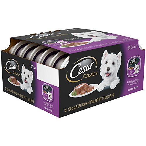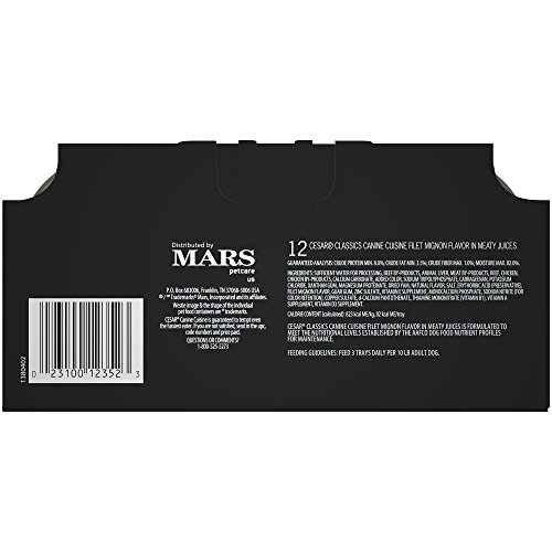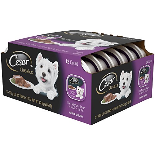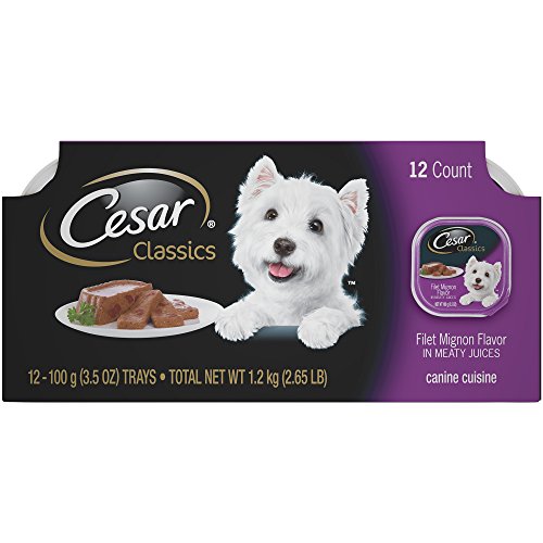 -. Binding : Misc. -. Brand : Cesar -. Feature : Contains (2) Multipacks of twelve (12) 3.5-oz. single-serve trays of Cesar Classics Filet Mignon Flavor Wet Dog Food in each Multipack / This gourmet wet food for dogs is served in convenient single-serve trays with easy, peel-away freshness seals / CESAR Canine Cuisine provides complete and balanced nutrition in a pate formulated just for adult dogs / This savory dog food is fortified with vitamins and minerals to help dogs of all sizes, especially small breeds, stay healthy -. Label : Mars Petcare -. Manufacturer : Mars Petcare -. Model : 10165431 -. MPN : 10165431 -. NumberOfItems : 1 -. PackageQuantity : 1 -. PartNumber : 10165431 -. ProductGroup : Pet Products -. ProductTypeName : PET_SUPPLIES -. Publisher : Mars Petcare -. Size : 5.29 lb -. Studio : Mars Petcare -. Title : CESAR Classics Filet Mignon Flavor Adult Wet Dog Food Trays 3.5 Ounces (2 Packs of 12)