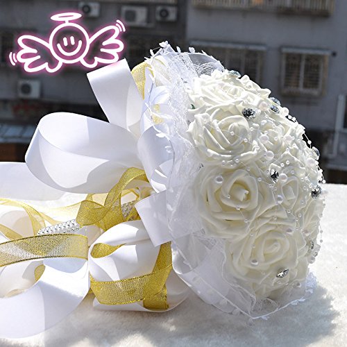 - Feature : Bridal Bouquet made with 18 pcs Rose,flower style rhinestone,pearls chains Stain Ribbon / 18pcs Bridal Bouquet 20cm W 28cm H / Silk flowers won't wilt in the heat or freeze in the cold. The consummate choice for all weather conditions / You can use flowers that may normally be out of season and there are also a wide variety of colors, above and beyond the limitations of mother nature. / The silk flowers available to us today are so glamorous and realistic you will be amazed. We think that many of the flowers are even more vibrant and beautiful that their fresh counterparts.
