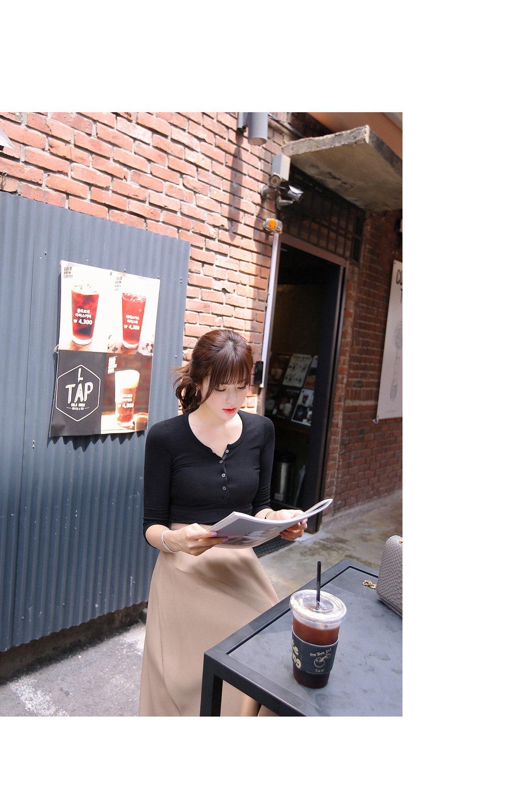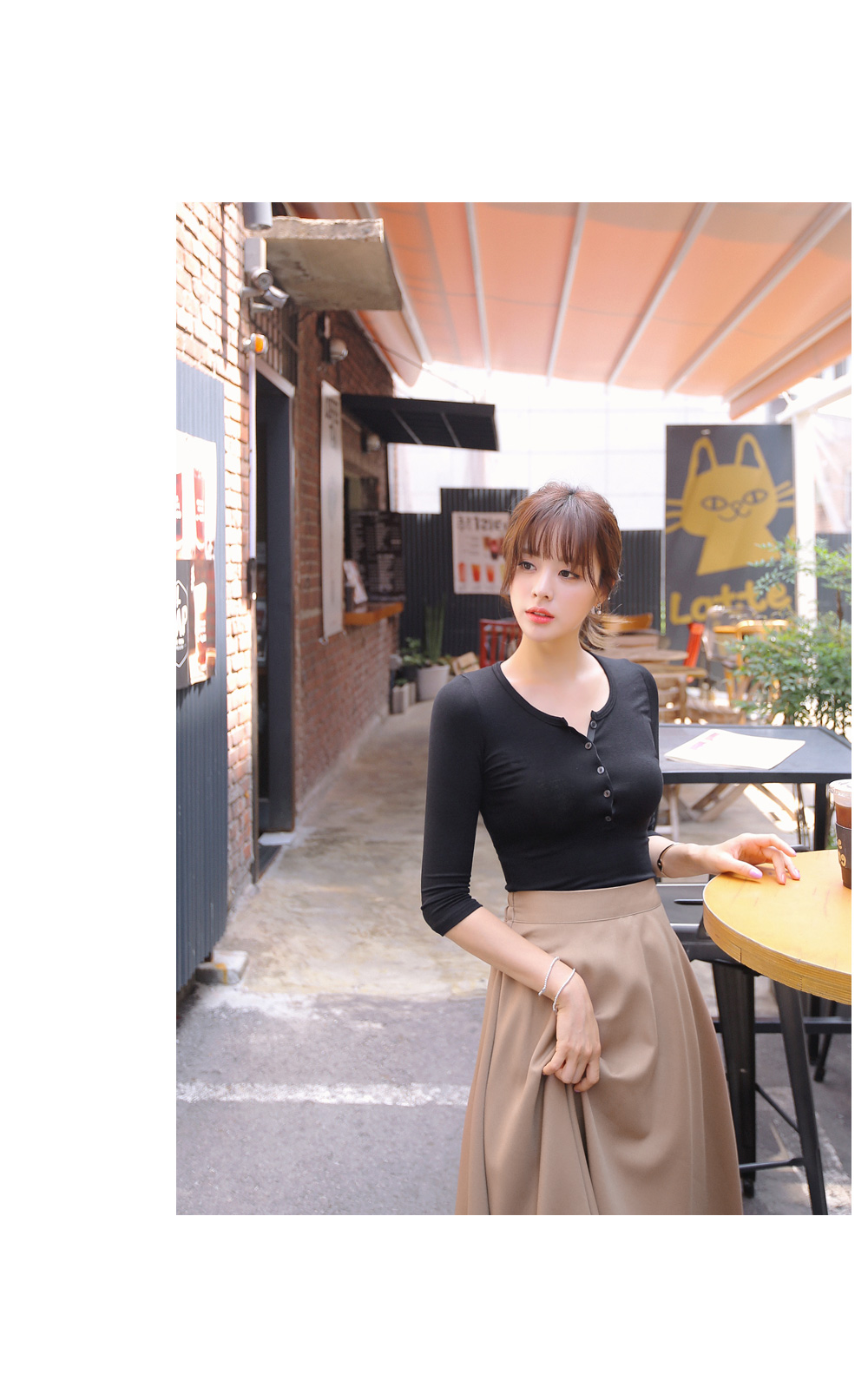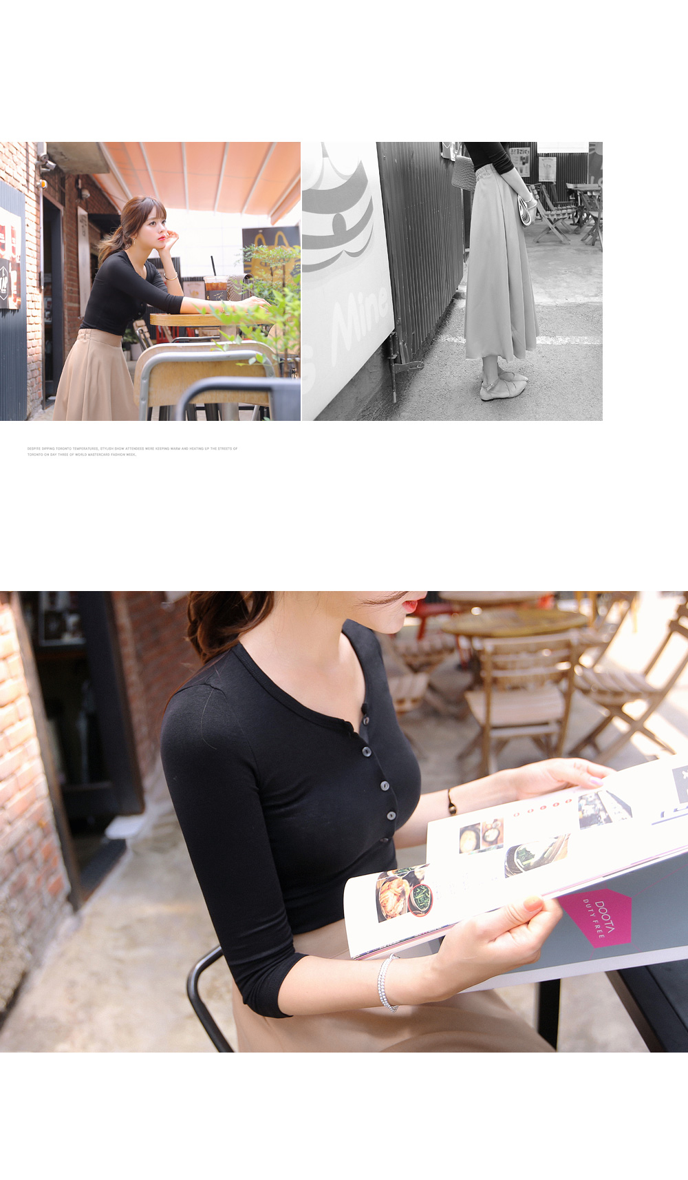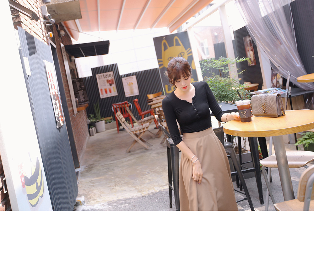 이루어져 있는 슬림핏 7부소매 반오픈 단추 포인트 티셔츠랍니다 ^^