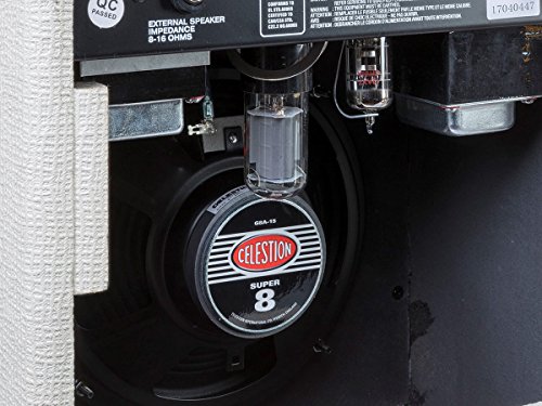 Studio : Monoprice Inc. Publisher : Monoprice Inc. Binding : Electronics Product Description Get superior guitar tone in a small package using this 5-Watt 1x8 Guitar Combo Tube Amplifier with Celestion Speaker from Monoprice! As the title indicates, this guitar amplifier features a 5-watt tube power amplifier and a Celestion brand speaker. It uses a ECC83/12AX7 preamplification tube and a 6V6GT power tube for the amplifier section, plus a Celestion Super 8 GBA-15 speaker. The amplifier handles frequencies between 80Hz and 10kHz, with hum and noise -75dB below the rated power and 0.5% total harmonic distortion. It includes a Low input and a High input, with the former attenuating the signal by approximately 50% and the latter being easier to overdrive. The cabinet is ported in the rear and features a leather handle, cloth speaker grill, and a cream-colored, textured, synthetic leather exterior with chrome corner guards. 0