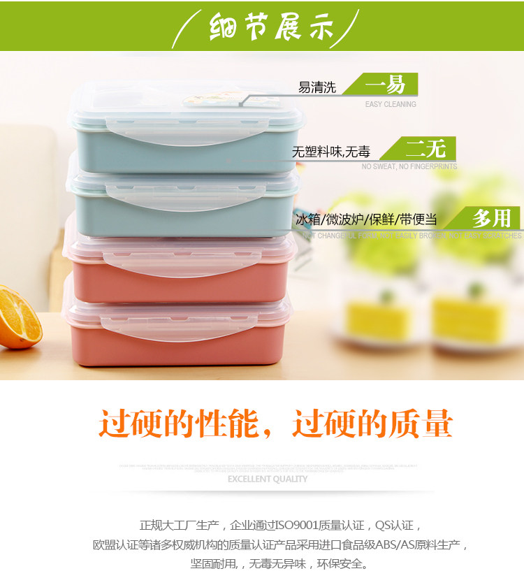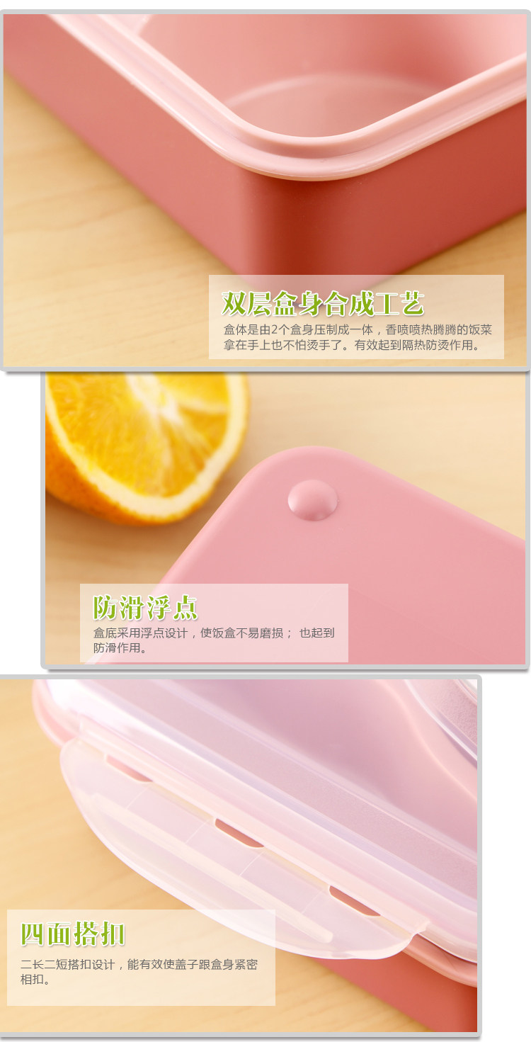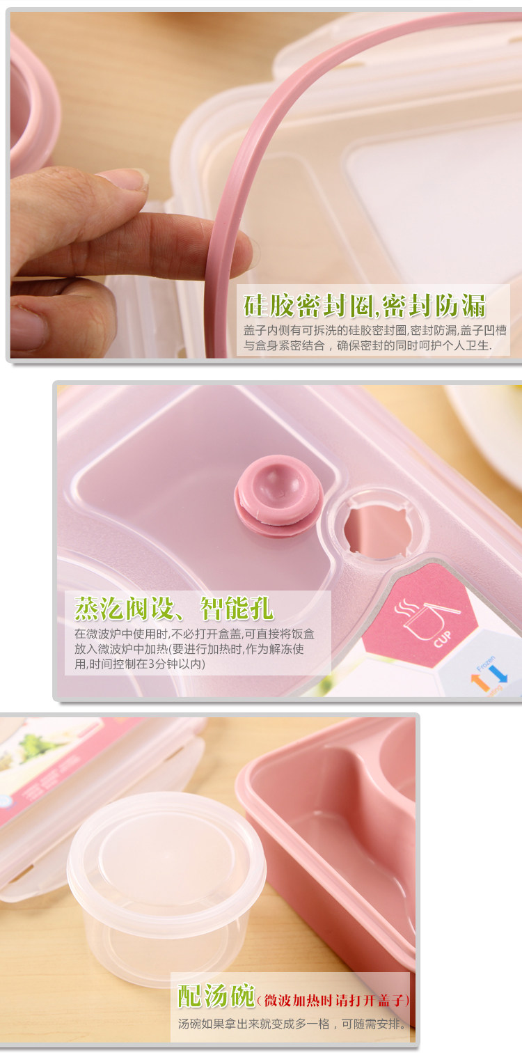 .在冷冻室使用时,与液体凝结会产生膨胀导致容器变形,因此水分多的食物只能放入容量的3分之2 产品特征: .专用优质进口食品级耐高温加热原料制造,安全无毒,使用开水烫也不会产生难闻的塑料味 .具有超强的隔层防漏功能,解决了饭菜互相渗透和窜味的问题,无需担心因菜汁的渗漏而影响到饭菜的味道和雅观 .此饭盒可做保鲜盒使用,储存食物不窜味,延长食物保鲜期 .具有良好的耐热耐寒性,可用于微波炉冰箱冷藏室冷冻室洗碗机里使用 .内壁超凡的表面光洁度不亲油腻,极易清洗 .独特蒸汔阀设计,加热时保持饭菜水分,锁定美味 .特有智能孔,自动加热透气、自动冷藏密封。 .食物分格,保鲜食物原味,防止串味,饭菜分开更健康。 .盖子内侧拥有可拆洗的硅胶密封圈,密封防漏,盖子凹槽与盒身紧密结合,确保密封性的同时呵护个人卫生。 .方便携带,可当作野外餐盒使用 .材料上乘,做工精细,是送礼的佳品 |