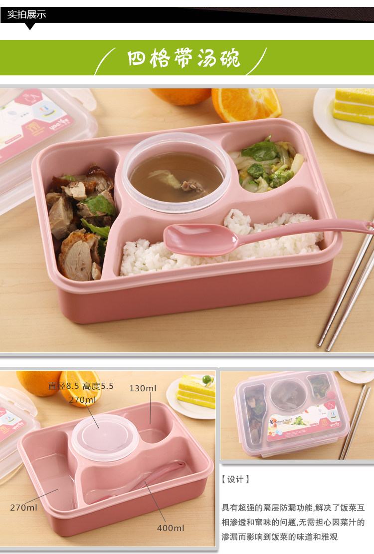 ?容????量:1000ml (大格:280ml,中格:220ml,小格:130ml,汤杯:210ml) ?颜????色:褐红色 蓝色? 2种颜色可供选择 ?产品尺寸:长:24.1cm×宽:18.2cm×高:6.9cm(包括盖子尺寸)? 饭盒内格尺寸:长:21.7cm×宽:15.8cm×高:5cm ?一箱数量:48只 ?温馨提示: .微波时不能使用烧烤功能 .独特智慧心透气孔设计,微波时不必打开盖子 .此产品不可直接有明火上加热,不可作烹饪用途 .适用温度:-20℃--120℃ .请在密封前确保盖及盒子的清洁 .避免加热油、脂肪、糖或西红柿等,以免污点残留在容器上,也可以消除高温带来的附加危险 .在微波炉中?褂檬?,不必打开盒盖,可直接将饭盒放入微波炉中加热(要进行加热时,作为解冻使用,时间控制在3分钟以内)