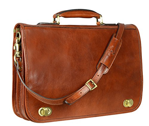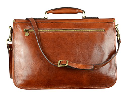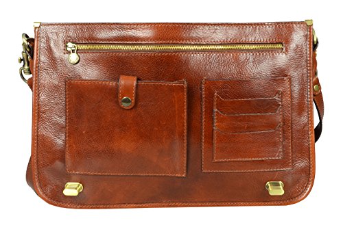 -. Feature : Design - formal yet poetic. A brown genuine leather briefcase that serves as a bridge between two worlds- it adds an artistic feel to business wear or gives a formal polish to casual attire. For one, who is maneuvering between creative and corporate. Pair with the spirit of reinvention. / Laptop size • Fits a laptop up to 15" in diameter (e.g. MacBook 15" as well as MacBook Air) Gadget friendly • Pocket to keep your tablet at convenient reach. • Organizer panel for smartphone, pens and cards. For your carrying comfort • A carry handle for easy carrying in hand. • Detachable shoulder strap, adjustable in length. / To stay organized • Multiple compartments and pockets outside and inside to organize your belongings. • An outside zip pocket right at your side; for things you want to keep close for safety, but have easy access to while on the go. • Suitable for A4 documents. • A clasp to secure your keys (no more digging around looking for them). Better safe than sorry • Reliable brass hardware. • Twist-lock closure. / Materials • Exterior made from genuine top grain calfskin that will last you for decades. • Leather interior. • We are well aware that men don't look forward to getting re-accustomed to a new bag. Therefore we make sure to offer quality materials that will last long and require little maintenance. It will be a good while before you feel any need to look for another bag. / Tan • Hand dyed using vegetable tanning method, which utilizes only natural materials and doesn't contain harmful chemicals. • This artisan technique maintains the natural look of leather, rendering each skin one of a kind with a slightly different pattern. • As an added bonus, vegetable tanning gives it a natural earthy smell.