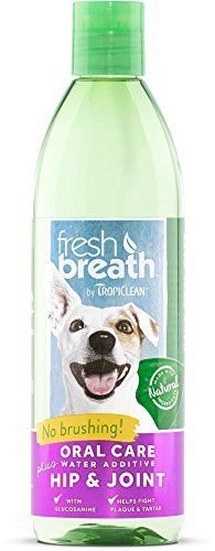 -. Binding : Misc. -. Brand : Tropiclean -. EAN : 0884958993320 -. Feature : Oral care water additive that provides dogs and cats with essential daily oral hygiene / Promotes healthy gums and eliminates bad breath for up to 12 hours / Glucosamine added to promote healthy hips and joints and overall health and mobility / Glucosamine also helps to ease common discomforts caused by canine arthritis disc degeneration hip dysplasia and more -. Label : TropiClean -. Manufacturer : TropiClean -. PackageQuantity : 1 -. ProductGroup : Pet Products -. ProductTypeName : PET_SUPPLIES -. Publisher : TropiClean -. Studio : TropiClean -. Title : Fresh Breath Oral Care Water Additive Plus Hip & Joint, 33.8oz -. UPC : 884958993320