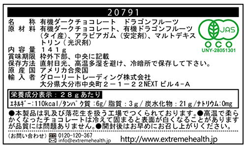 原材料:有機ダークチョコレート、有機ドラゴンフルーツ(タイ産)、アラビアガム(安定剤)、マルトデキストリン(光沢剤)
