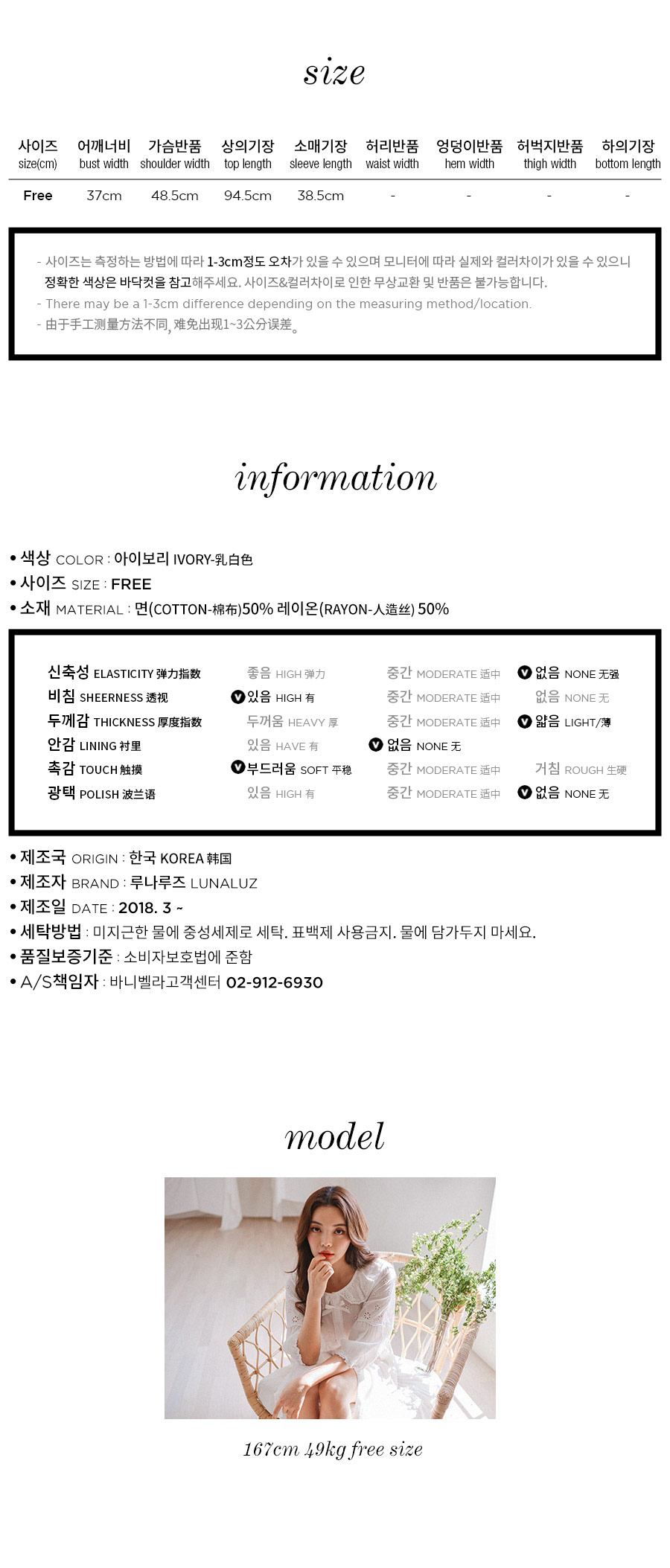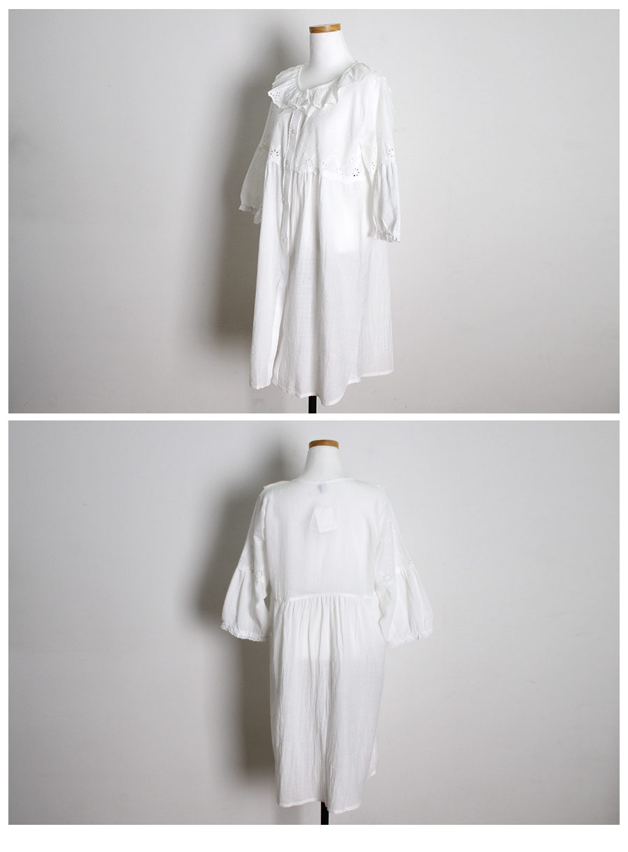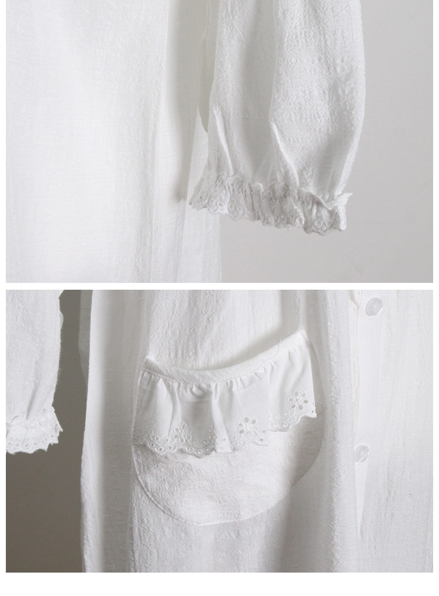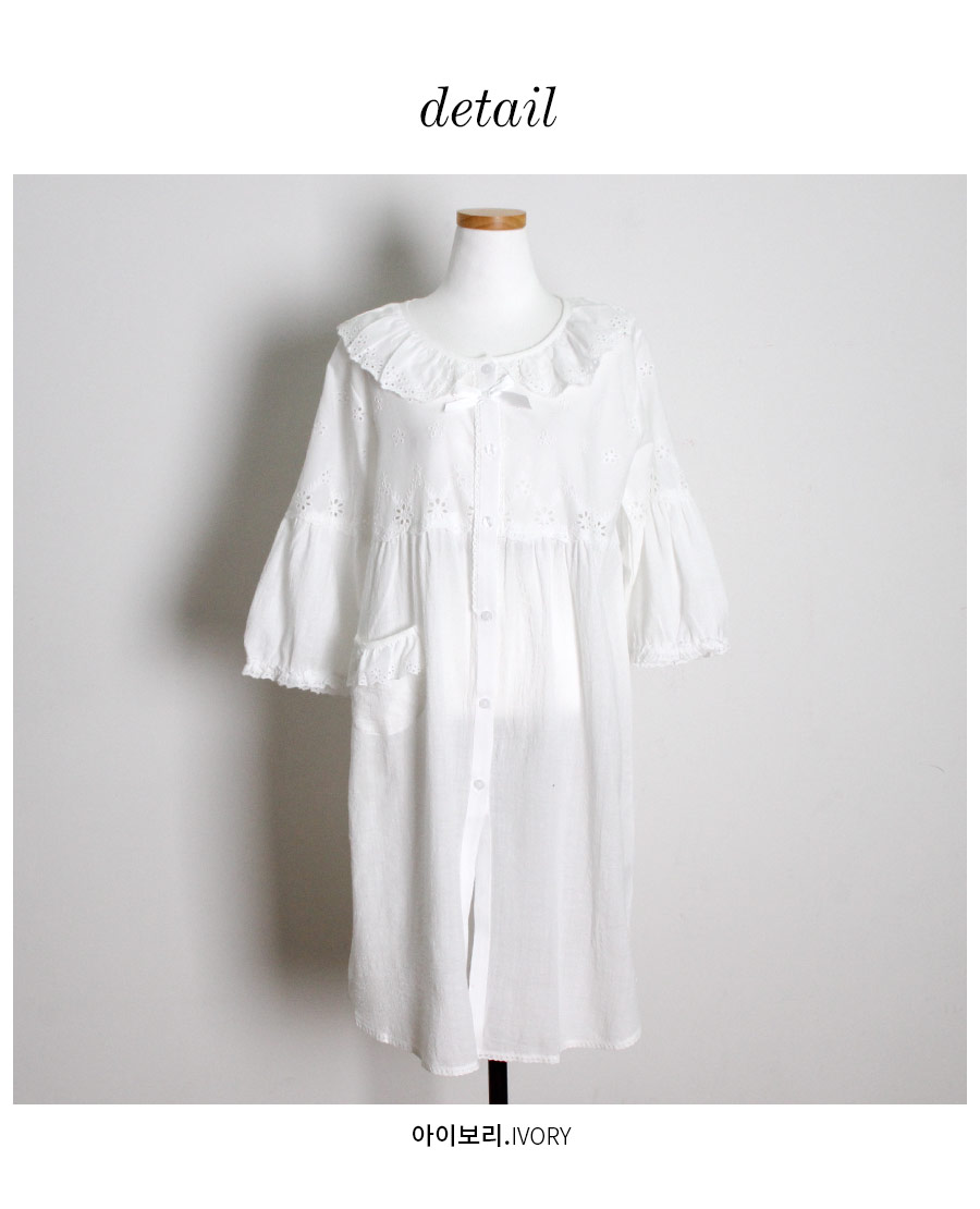 레이온 소재의 올록볼록한 텍스쳐가 시원하고 피부를 상쾌하게 해주는데요. 피부에 들러붙지 않고 통풍이 우수해 S/S 시즌에 착용하기 좋습니다. 아일렛 펀칭 디테일이 여성스럽고 섹시한 분위기를 더해줍니다. 원단을 믹스매칭해 훨씬 매력적으로 보이는 슬립웨어로 적극 추천해드립니다. 컬러는 퓨어한 아이보리 1가지 컬러로 제작했습니다. 봄, 여름에 입기 좋은 가벼운 소재와 페미닌한 무드가 느껴지는 잠옷입니다. DETAIL 편안해 보이는 라운드 네크 라인으로 면 레이스 장식을 길게 내어 상대적으로 얼굴은 슬림 해 보이는 효과를 줍니다. 전체 버튼형 잠옷으로 탈 착용이 편합니다. 클로징 버튼을 따라 양 사이드에 자수 레이스 장식을 봉제해 포인트를 주었어요. 아일렛 펀칭 원단과 레이온 원단을 패턴에 따라 조각 내어 다시 한 번 봉제한 슬립웨어 입니다. 상의 윗판의 아일렛 원단은 하단의 스칼럽을 살려 섬세하게 봉제했습니다. 미니 포켓을 달주고 소매의 끝단과 원피스의 끝 단에 레이스 장식을 다시 한 번 살려주면서 마무리했습니다. 전체적으로 페미닌한 무드가 느껴지는 잠옷으로 부담스럽지 않으면서 편안하게 연출하기 좋은 슬립웨어 100% 국내 생산으로 봉제선이 깔끔하고, 디자인과 부자재, 소재의 퀄리티가 높습니다. SIZE 44반size~66반size까지 커버 가능한 free사이즈입니다.