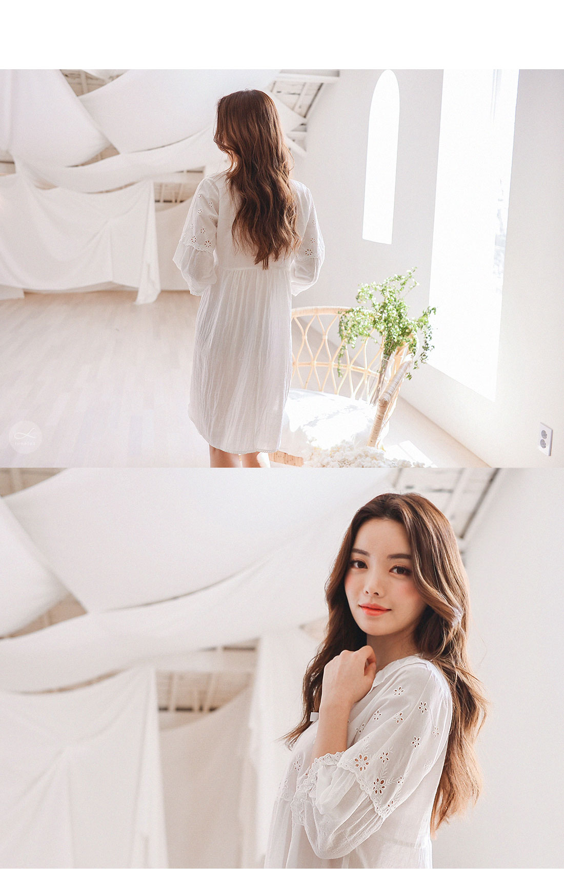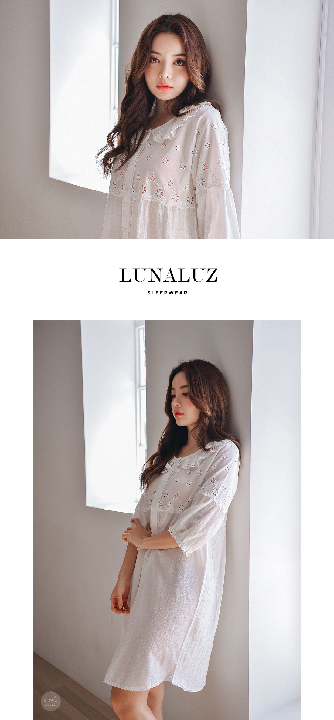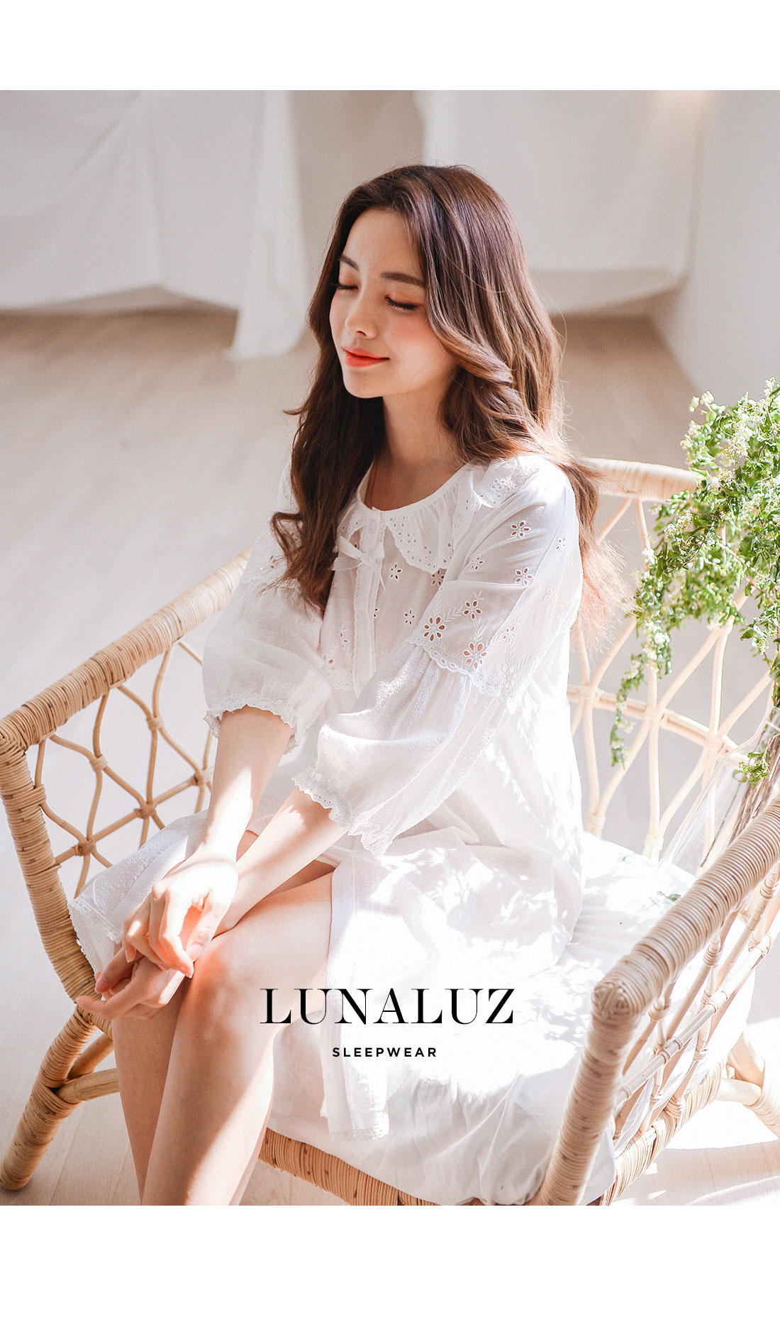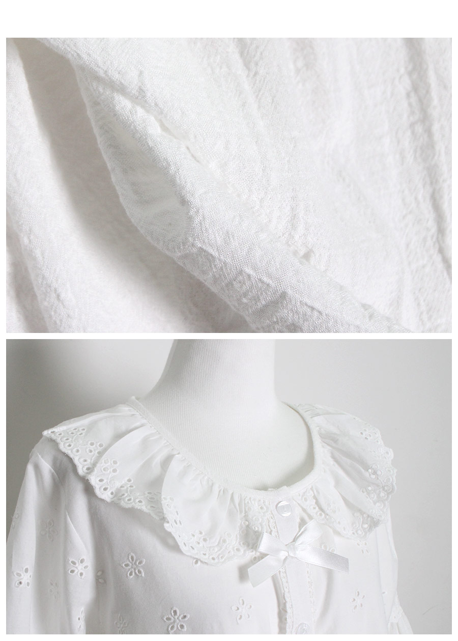 레이온 소재의 올록볼록한 텍스쳐가 시원하고 피부를 상쾌하게 해주는데요. 피부에 들러붙지 않고 통풍이 우수해 S/S 시즌에 착용하기 좋습니다. 아일렛 펀칭 디테일이 여성스럽고 섹시한 분위기를 더해줍니다. 원단을 믹스매칭해 훨씬 매력적으로 보이는 슬립웨어로 적극 추천해드립니다. 컬러는 퓨어한 아이보리 1가지 컬러로 제작했습니다. 봄, 여름에 입기 좋은 가벼운 소재와 페미닌한 무드가 느껴지는 잠옷입니다. DETAIL 편안해 보이는 라운드 네크 라인으로 면 레이스 장식을 길게 내어 상대적으로 얼굴은 슬림 해 보이는 효과를 줍니다. 전체 버튼형 잠옷으로 탈 착용이 편합니다. 클로징 버튼을 따라 양 사이드에 자수 레이스 장식을 봉제해 포인트를 주었어요. 아일렛 펀칭 원단과 레이온 원단을 패턴에 따라 조각 내어 다시 한 번 봉제한 슬립웨어 입니다. 상의 윗판의 아일렛 원단은 하단의 스칼럽을 살려 섬세하게 봉제했습니다. 미니 포켓을 달주고 소매의 끝단과 원피스의 끝 단에 레이스 장식을 다시 한 번 살려주면서 마무리했습니다. 전체적으로 페미닌한 무드가 느껴지는 잠옷으로 부담스럽지 않으면서 편안하게 연출하기 좋은 슬립웨어 100% 국내 생산으로 봉제선이 깔끔하고, 디자인과 부자재, 소재의 퀄리티가 높습니다. SIZE 44반size~66반size까지 커버 가능한 free사이즈입니다.