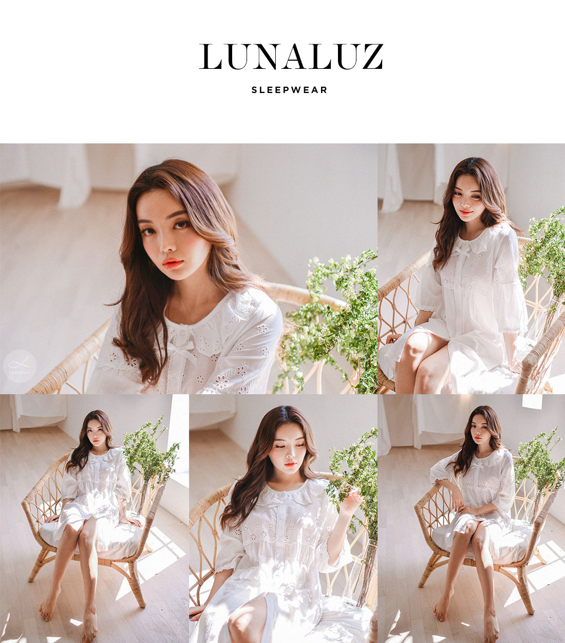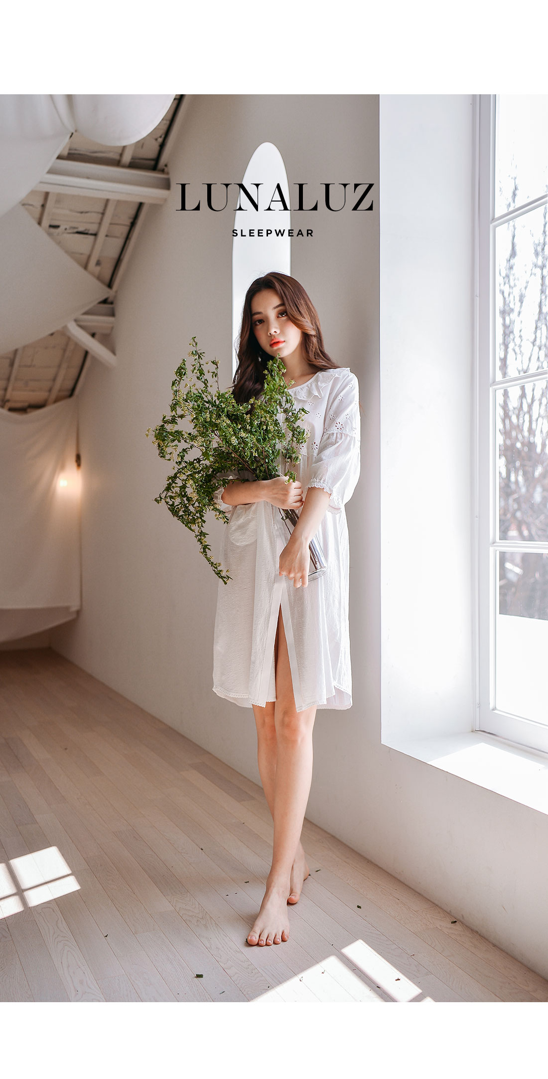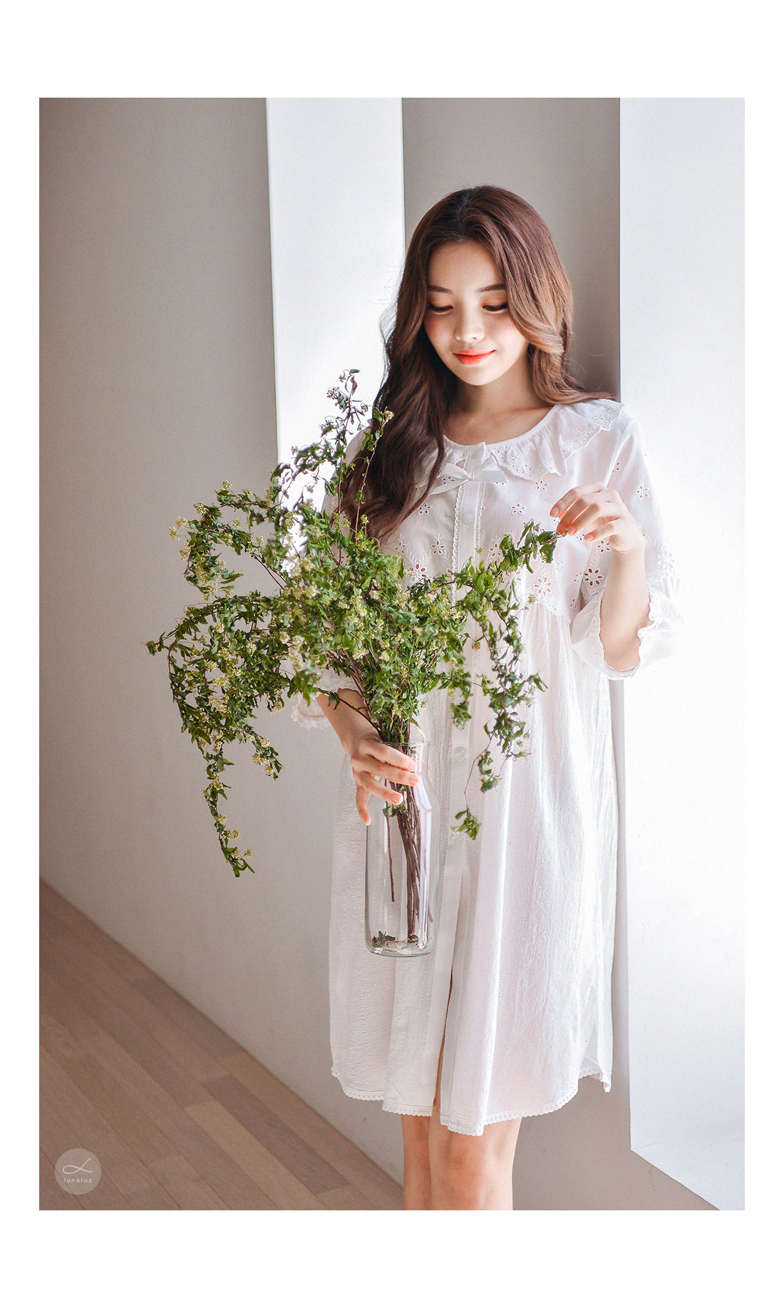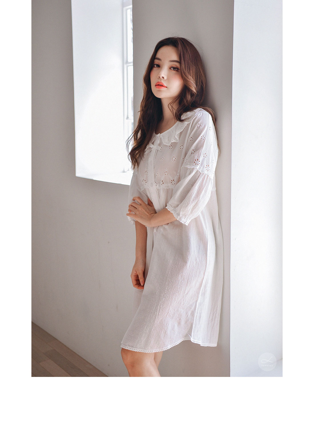 레이온 소재의 올록볼록한 텍스쳐가 시원하고 피부를 상쾌하게 해주는데요. 피부에 들러붙지 않고 통풍이 우수해 S/S 시즌에 착용하기 좋습니다. 아일렛 펀칭 디테일이 여성스럽고 섹시한 분위기를 더해줍니다. 원단을 믹스매칭해 훨씬 매력적으로 보이는 슬립웨어로 적극 추천해드립니다. 컬러는 퓨어한 아이보리 1가지 컬러로 제작했습니다. 봄, 여름에 입기 좋은 가벼운 소재와 페미닌한 무드가 느껴지는 잠옷입니다. DETAIL 편안해 보이는 라운드 네크 라인으로 면 레이스 장식을 길게 내어 상대적으로 얼굴은 슬림 해 보이는 효과를 줍니다. 전체 버튼형 잠옷으로 탈 착용이 편합니다. 클로징 버튼을 따라 양 사이드에 자수 레이스 장식을 봉제해 포인트를 주었어요. 아일렛 펀칭 원단과 레이온 원단을 패턴에 따라 조각 내어 다시 한 번 봉제한 슬립웨어 입니다. 상의 윗판의 아일렛 원단은 하단의 스칼럽을 살려 섬세하게 봉제했습니다. 미니 포켓을 달주고 소매의 끝단과 원피스의 끝 단에 레이스 장식을 다시 한 번 살려주면서 마무리했습니다. 전체적으로 페미닌한 무드가 느껴지는 잠옷으로 부담스럽지 않으면서 편안하게 연출하기 좋은 슬립웨어 100% 국내 생산으로 봉제선이 깔끔하고, 디자인과 부자재, 소재의 퀄리티가 높습니다. SIZE 44반size~66반size까지 커버 가능한 free사이즈입니다.