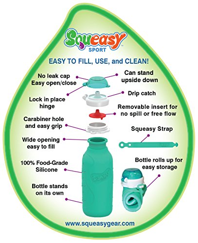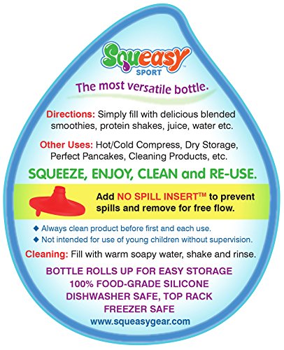 Studio : Squeasy Gear, Inc. Publisher : Squeasy Gear, Inc. Binding : Misc. Product Description The Squeasy SportTM?is the most versatile reusable sport bottle on the market. It was designed to provide not only hydration but easy feeding on-the-go. It is the only sport bottle that offers the patent pending 2-in-1 removable?NO SPILL INSERTTM?for no spill or free flow. It works great with any of your favorite hydration drinks, smoothies, protein shakes, etc. The 100% silicone bottle collapses completely flat and can be rolled up for easy storage. 0