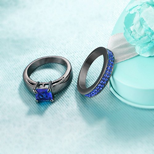 -. Title : 2 Piece Blue Zircon Black Gold Plated P.R.Incess Cut Wedding Engagement Ring Set Size 5-11