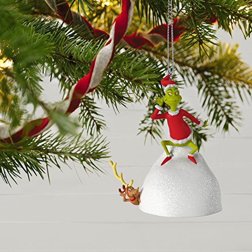 This Christmas tree ornament shows the Grinch and his "reindeer" dog Max listening to the joyous celebration down in Whoville. Plays the song "Welcome Christmas." Two replaceable LR44 alkaline batteries included.