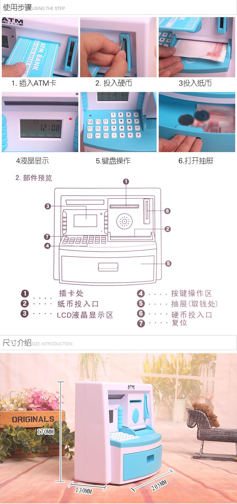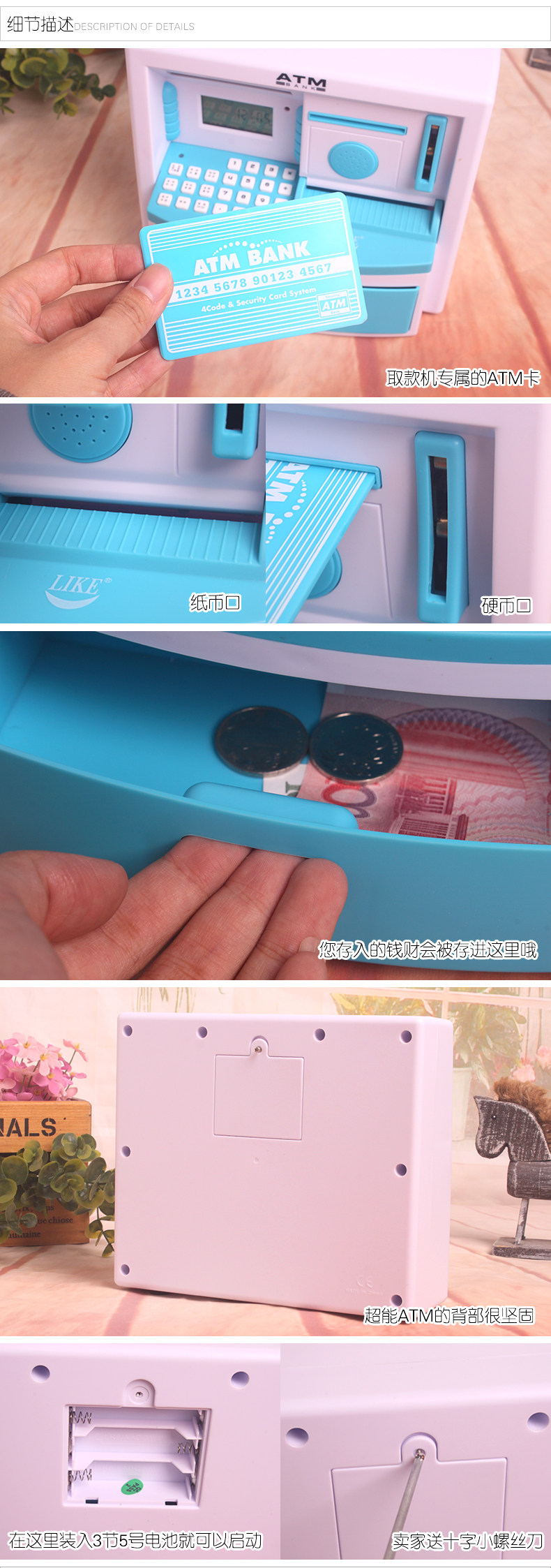 Material: plastic, LCD, electronic components Size: 21 * 9.5 * 18cm Other parameters: Section three AA batteries (the product itself unworthy of belt) Function Description: 1 coin denomination voice broadcast feature 2, coin denomination automatically recognize and display functions 3, ID card and password withdrawals function 4, when withdrawals have LED lights and voice prompts 5, more than 15 seconds to open the drawer automatically alerts feature 6, establish savings plans, goal setting, financial management capability features an auxiliary culture 7, storage balance inquiry function 8, password settings, and modify the function (default password is 0000) 9, eight letters provide computing functions Calculator 10, there is time, date and alarm functions