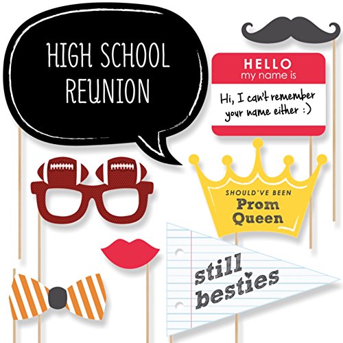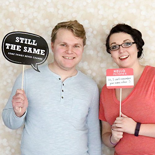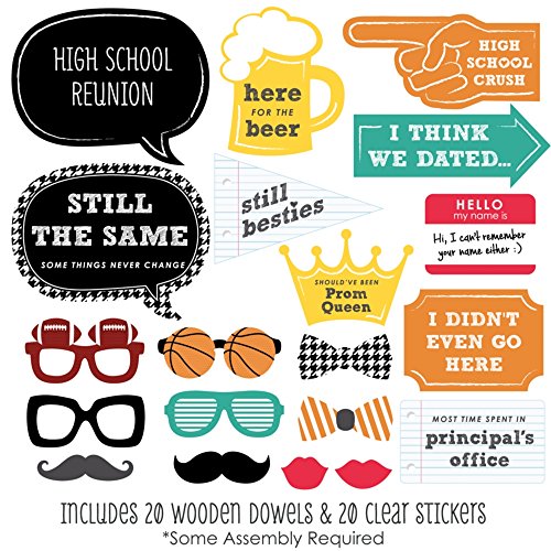 20-Piece Funny Class Reunion Party Photo Booth Props Kit INCLUDES 20 Class Reunion photo booth props, 20 wooden dowel sticks and adhesives for assembly. EASY ASSEMBLY: Simply attach the printed DIY photo booth props to the wooden dowels with included adhesive and reinforcing stickers.