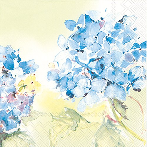 - The creamy wash of yellow background sets off 2 color washed blue Hydrangeas
