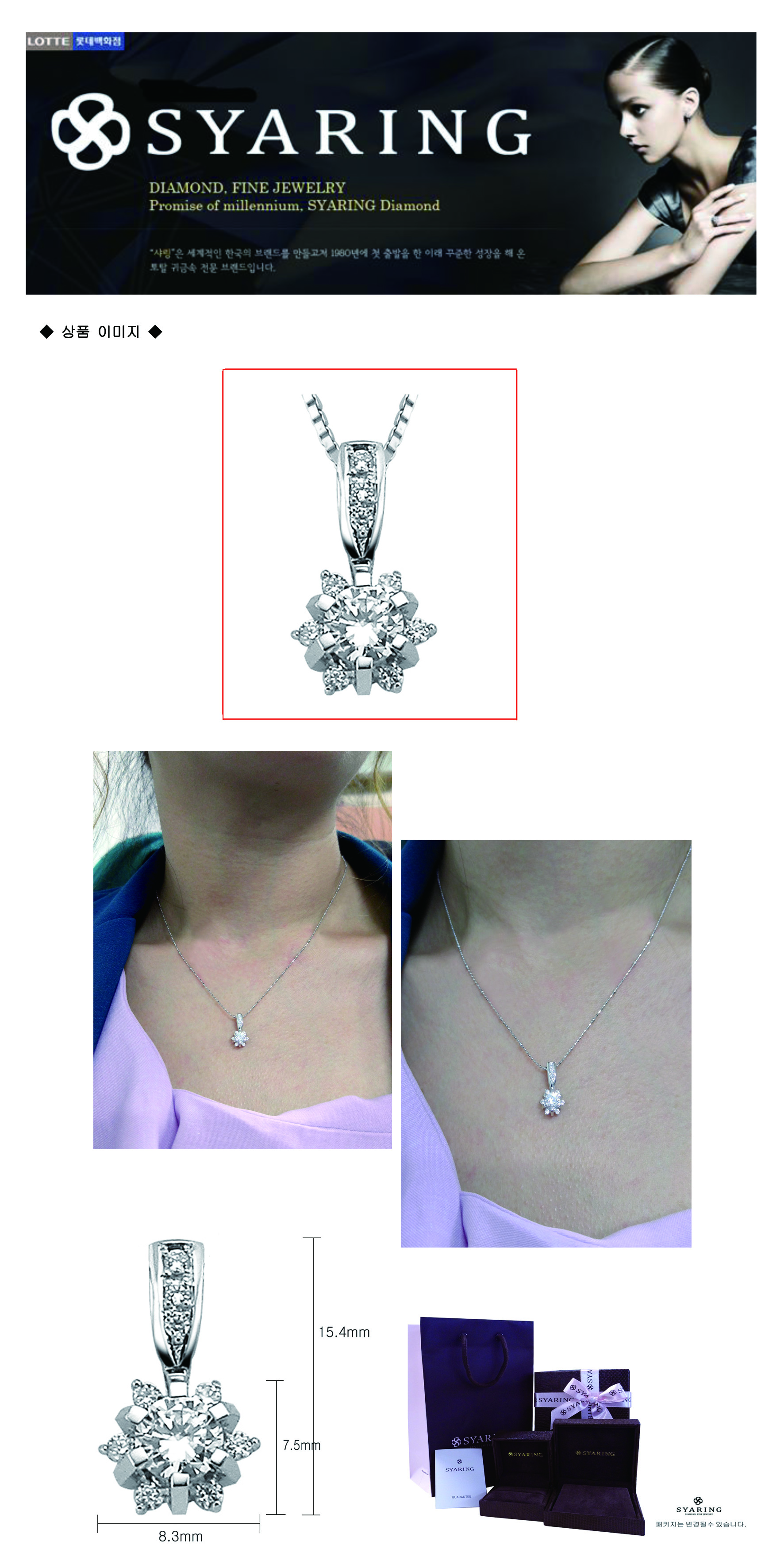| 참고사항 | * 중량표기는 평균중량이므로 약간의 오차가 있을 수 있습니다. * 보증서 기본 제공하나, 다이아몬드감정서는 2부 이상에만 발행됩니다. * 펜던트 상품엔 체인 미포함입니다. * 샤링의 모든 제품은 고객 한분, 한분을 위한 주문제작 상품이므로 주문취소 할 경우에는 주문 당일 24시간 이내에만 가능합니다. * 주문제작 상품은 구매 후 단순 변심인 경우, 교환 및 반품이 불가하오니, 주문전에 신중한 구매결정을 부탁 드립니다. * 주문 이후 취소 및 반품시 주문제작 위약금 10%(소비자가기준)를 지불하신 후 취소 가능합니다. |
