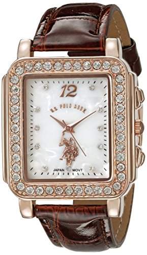 Rose gold watch square featuring white dial, rhinestone covered bezel, and brown PU strap with buckle