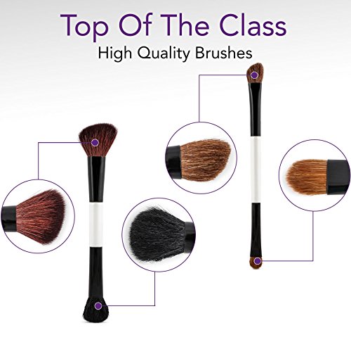 - LESS CLUTTER IN YOUR MAKEUP BAG Every woman knows how bulky beauty products can be, taking up valuable space in your makeup bag.This makes it difficult to sift through your items and find what you are looking for, particularly when you are in a hurry. The 2 in 1 makeup set gives you four makeup applicators in only two brushes, allowing for more room in your makeup bag.Throw away all the extra brushes in your tote because you’ll only need the Clarity Make Up Brush Set for all your beauty needs.