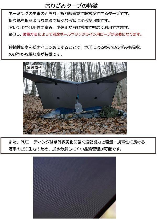 | ネーミングの由来のとおり、折り紙のような感覚で設営ができるタープです。タープを伸縮性に富んだナイロン製にすることで、地形による設営の多少のひずみも吸収。のびやかな張り姿が特徴です。また、PUコーティングは紫外線劣化に強く速乾能力と軽量・携帯性に長ける薄手の15D生地のため、加水分解しにくい品質管理が可能です。 |