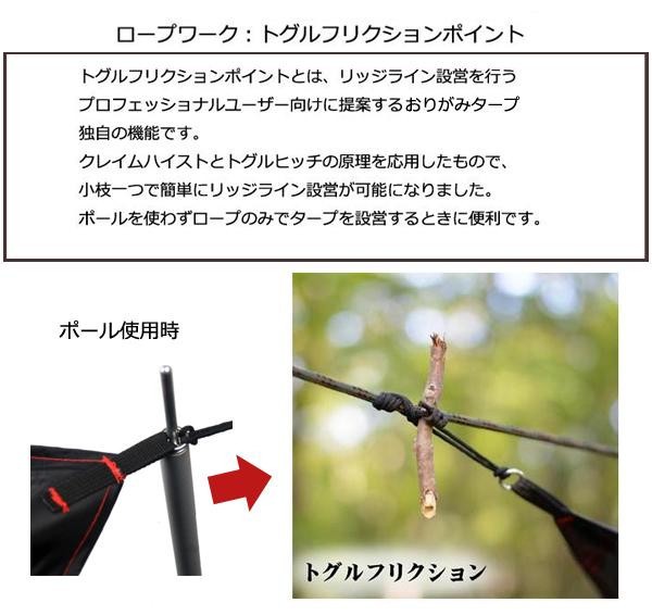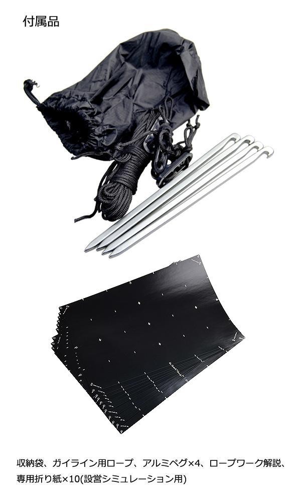 | 付属品 | 収納袋、ガイライン用ロープ(直径3mm×2m×4本)、アルミペグ×4、ロープワーク解説、専用折り紙×10(設営シミュレーション用) |