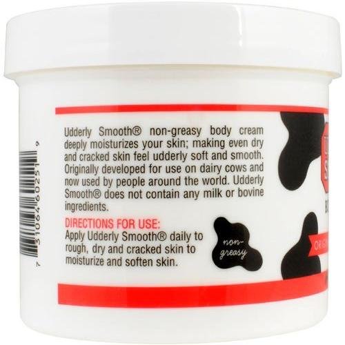 Udderly Smooth non-greasy body cream deeply moisturizes your skin; making even dry skin feel udderly soft and smooth. Formulated as a rich thick cream, original formula Udderly Smooth Body Cream is best for the toughest dry skin conditions. developed for use on dairy cows and now used by people around the world. Udderly Smooth does not contain any milk or bovine ingredients.