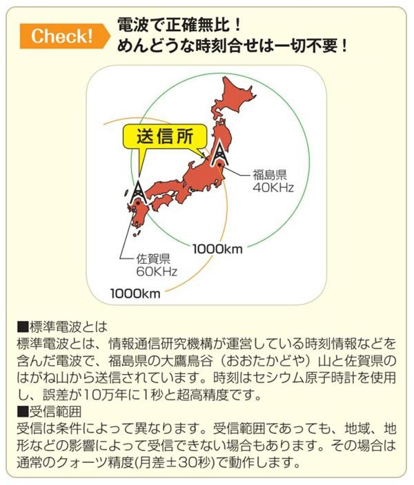8~12時間後のお天気予測と温度・湿度を表示。時計は標準電波を受信して正しい時刻に自動で修正するので時刻合わせは不要です。 |