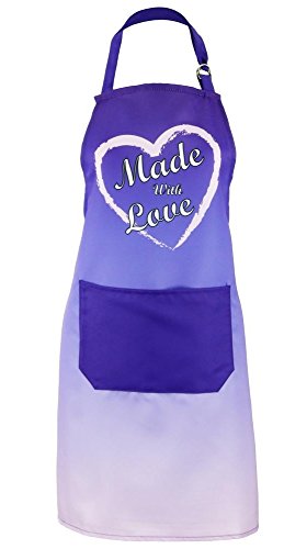 Our "Made with Love" Apron measures 30" H x 26" W (76 x 66 cm) and is made of 100% Cotton. It has an adjustable Neck Strap and a large Front pocket for recipes, utensils, etc.
