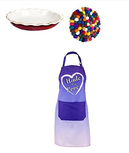 Made With Love Baker's Set: Apron, Cinnamon Red Stoneware Pie Plate and Colorful Felted Wool Ball Hot Plate (Round Hot Plate)