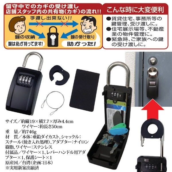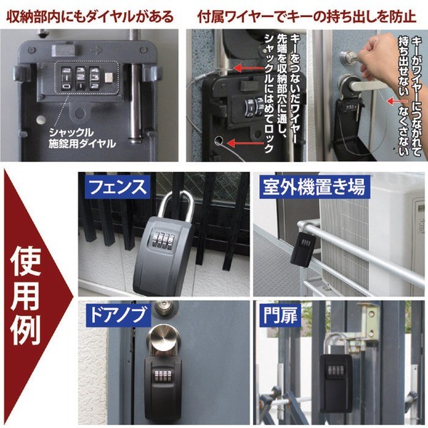 マンションやアパートなどの物件管理や建築現場などでの鍵の管理を安全に確実に行うための必須アイテムです。建築現場や物件管理では複数戸の管理は複雑になるため、物件に鍵を一時的にストックするBOXがよく使われます。しかし、物件の目に付く場所に取り付けておくため、セキュリティの精度も問われることになります。本製品は、大切な鍵を確実にストックしておけるように工夫がされた新アイテム。ボックス開閉のダイヤルキーとは別に本製品を物件に固定するためのシャックル部のダイヤルキーを独立させたW(ダブル)ダイヤル方式を採用。また、付属のワイヤーを使って鍵をシャックルにロックすることで、不正な持ち出しによる鍵の不正複製の防止も可能になりました。更に、ドアノブに本製品を取り付けることもできるアダプターも装備。ボックス容量は大型の鍵などを含め、複数の鍵類を一度に収めることができる大容量仕様となってます。