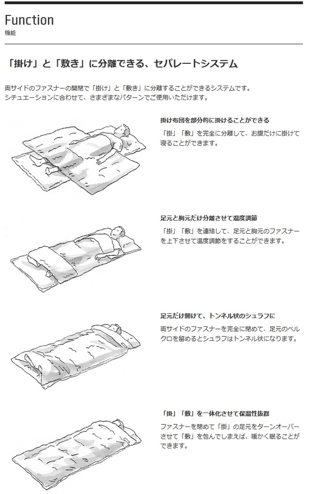 In a hot place it adopts a zipper in a turnover system that can open your feet in order to sleep coolly and closing the zipper in cold places will improve airtightness.