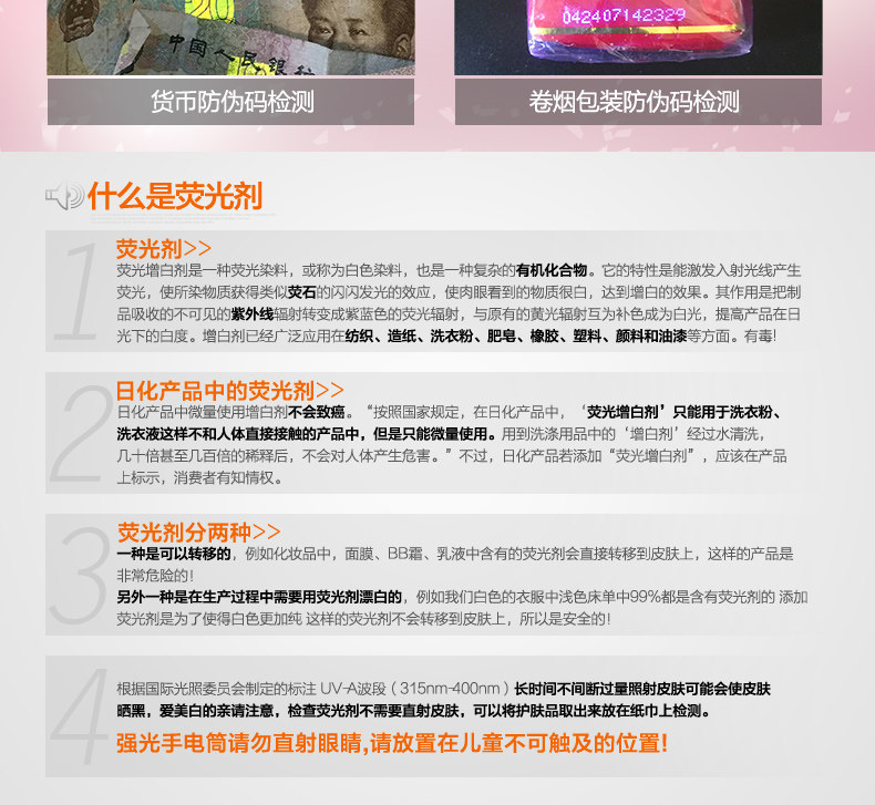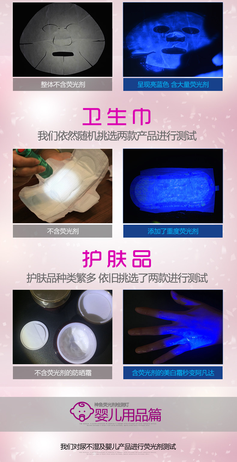 Fluorescent agents are two, one is able to transfer, such as cosmetics, facial mask, BB cream, lotion contains a fluorescent agent will be transferred directly to the skin, this product is very dangerous!