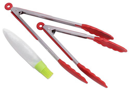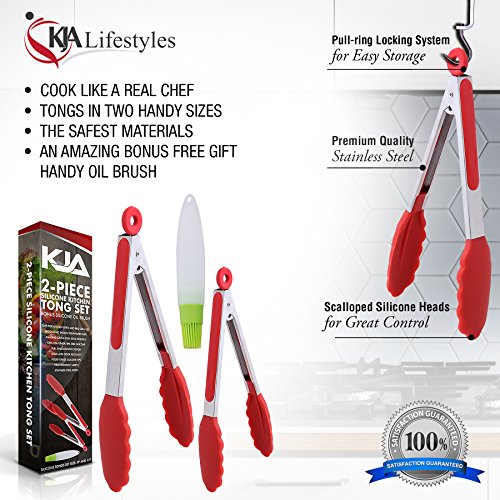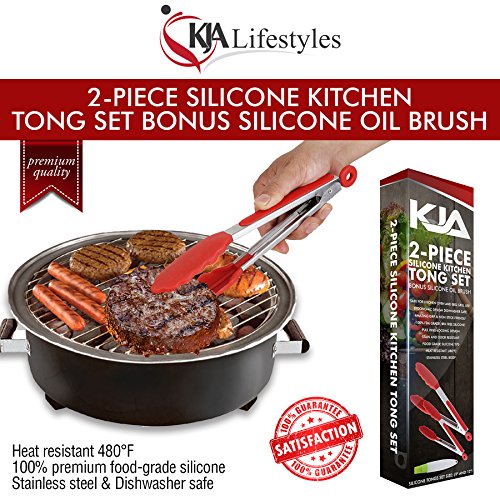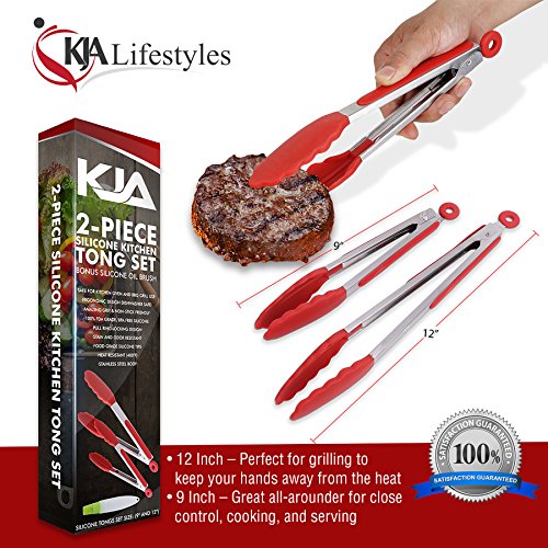KJA Premium Kitchen Tongs: Set Of 2 (9 and 12 inch) Food Tongs Made With Heat Resistant Silicone – Stainless Steel Utensil For Cooking, BBQ, Grilling, Salad, Fish & Serving – Free Silicone Oil Brush