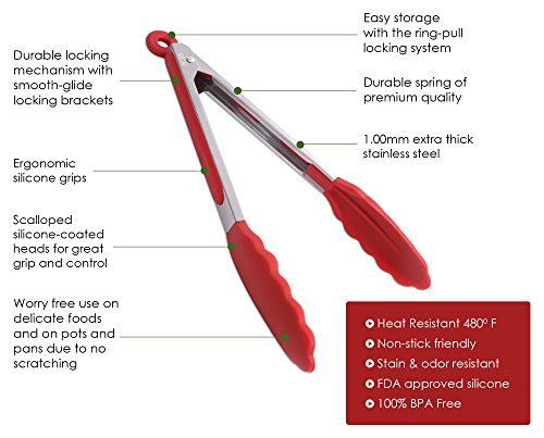 TONGS IN TWO HANDY SIZES: This is a set of 2 KJA Kitchen Tongs in two different sizes, a 12" and 9". Both equipped with a pull ring locking design. This set is very convenient, especially if you have invited friends or family over for lunch or dinner. You can use both of the Cooking Tongs to serve everyone easily!