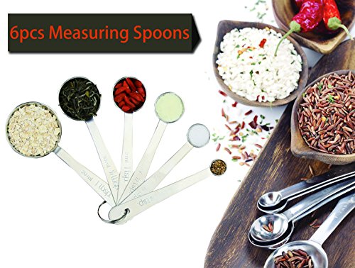 ★FUNCTIONAL DESIGN: Our spoon heads are designed in a way so as to allow the ingredients- both liquid and dry ones- to reach spice jars and other kind of containers easily, without hassle. Our measuring spoon set contains 6 products: 1/8-tsp, 1/4-tsp, 1/2-tsp, 1-tsp, 1/2-Tbsp. and 1-Tbsp. We are thinking of our buyers that’s why we provide you a unique D-shape ring which keeps the spoons together.