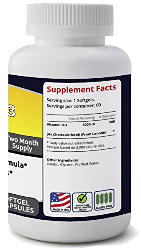 -. Feature : ★TWO-MONTH SUPPLY-60 Softgels for quick and efficient digestion. / ★NO PRESERVATIVES-Contains no: sugar, salt, starch, yeast, wheat, gluten, soy, milk, egg, shellfish or preservatives. Gluten Free / ★MADE IN THE USA IN A TRUSTED FACILITY-Vitamin D3 5000 IU by Nutrinalis® is produced in a FDA Inspected and GMP Certified facility according to strict GMP guidelines to ensure you receive the highest quality product possible. / ★ 100% MONEY-BACK GUARANTEE! At Nutrinalis® we fully stand behind all of our products. Try our Vitamin D3 5000 IU and see the difference for yourself. If you are not completely satisfied for any reason, we will gladly give you your money back, no questions asked!