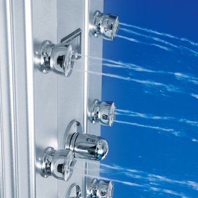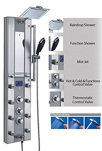 Shower panel has a rainfall shower head, a handheld shower head, body spray pattern, and tub filler. Plumbing components are included, super easy install