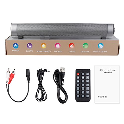 -. Feature : [SPECIAL DESIGN] - Multimedia speaker system Supports bluetooth mode, LINE mode, TF mode, when play music by bluetooth mode,there is phone call,speaker will stop play music and enter into voice call mode automatically. / [SUPPORTS VOICE PROMPT] - 10W Small Soundbar supports voice prompt when battery power lower than 3.3V over than 15s. speaker's notification sound is "power off" then turn off. Bulit-in 3.7V 1800mAh battery, use the usb cable to charge it after power off. / [TRUE HIGH-QUALITY SOUND] - Super bass stereo sound bar set, Magnetic, noise reduction, HIFI function enables speaker with clear sound, 360¡ãvolume adjustment wireless surround sound bar perfect for home, dorm room, kitchen, bathroom, car, parties. / [MULTI-MODES SPEAKER] -The Small sound bars can work in PC, smartphone, MP3, MP4 and be a small TV speaker, it use 3.5mm line-in jack, also support external audio devices, allows you to stream music to your other devices.Tips - If you want to connect this speaker with your TV, pls make sure your TV with 3.5mm Aux hole. It also support TF Card mode, enjoy your favorite music from your TF Card. / [NEW BLUETOOTH 4.0 TECHNOLOGY] - This soundbar is with Bluetooth 4.0, bluetooth module adopts RF technology. Effective distance can reach to 10 meters. It also support HSP, HPP,A2DP,AVRCP format. 1 Year Extended Warranty,Take one for yourself or your friends ,Enjoy the life.