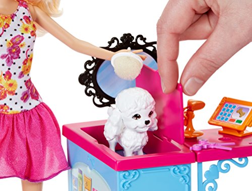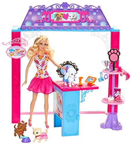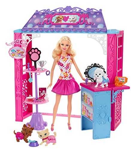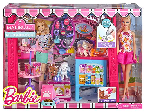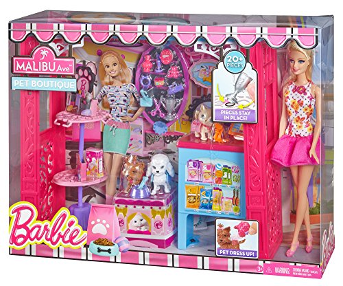 Barbie Life in the Dreamhouse is absolutely amazing, but Barbie doll also loves to get out and shop - some of her favorite spots are on Malibu Avenue, including the glam Market, pretty Pet Boutique and chic Bakery (each sold separately). Each set features a fabulous store frame with Barbie signature style and a Barbie doll in a fabulous fashion for playing out lots of fun stories. Large accessories are designed to display merchandise, complete services and check out and each set has a unique feature. The Market has a working conveyor belt that drops food into a grocery bag (with a simple push mechanism); the Pet Shop comes with three adorable animals; and the Bakery features a spinning display case (simply crank the lever). Additional pieces permit complete play - Barbie doll can push the grocery cart to complete her food shopping; grooming accessories add salon fun to the pet boutique; and a table and two chairs are the perfect spot to indulge in a treat at the bakery. And of course, each shop also has lots of merchandise to allow for more storytelling fun! Plus, decorative grooves on some pieces hold smaller plug 'n play accessory items in place! Collect all of the sets from the Malibu Ave. Shops collection (each sold separately) to build out the street. Includes Barbie doll, shop frame, display unit, additional furniture, one register and multiple themed accessories. Ages 3 and older.Feature