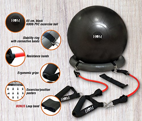 Studio : HOM Publisher : HOM Binding : Misc. Product Description Highly recommended by medical and rehabilitation professionals for back pain. All-in-one complete at-home system for full body workout featuring FREE resistance band to target glutes, outer/ inner thighs, while strengthening lower abs. The Basics: -65 cm Balance Ball, 100% recyclable, hypo-allergenic, and non-slip and no stick. Our ball has a desirable "watermelon design" that comfortably conforms to your body without sticking to your skin or collecting dust. -Stability Ring Base, our base has updated thicker walls to ensure stability in your workouts. -Resistance Straps to connect to the Stability Ring offering customizable tension up to 25 lbs. What Sets HOM apart: -HOM is proud to offer our customers two FREE items with the purchase of our at-home training system: a workout poster and resistance band. -Workout Poster featuring over 100 exercise specifically designed for this system. -Resistance Band offering hundred more variations and capable of targeting the legs, hips, and glutes. -Foot Pump for those with compromised grip strength, arthritis, or for anyone who doesn't want to spend 30 minutes pumping up their balance ball! -100% metal clips on both straps and stability ring. The HOM system is able to recruit multiple muscle groups at a time. We feel the addition of our resistance band will allow for a true full body workout. Our ball is also lightweight, and easy to fit in any vehicle for use in the office or to replace your desk chair. 0