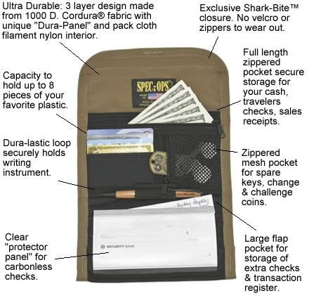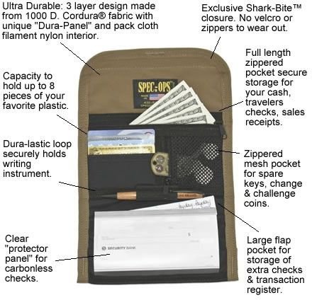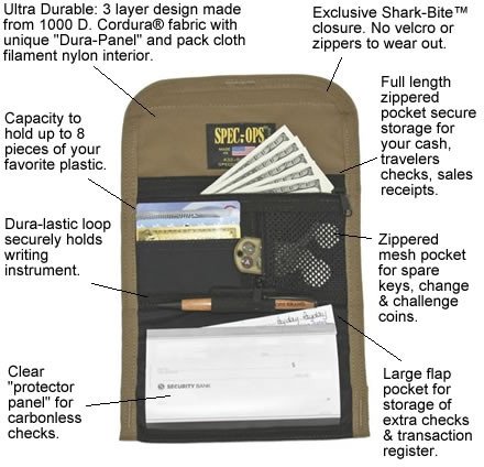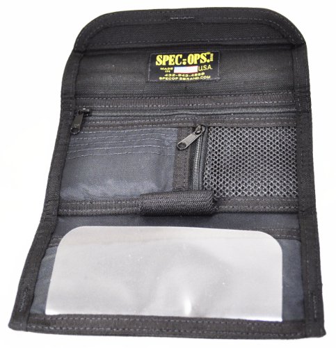 ReleaseDate : 2011-04-13 Studio : Spec Ops Publisher : Spec Ops Binding : Sports Product Description Features Benefits: Inside and outside ID windows. Holds a passport or other large travel documents. Zippered coin pocket. 3-slot pen/spare key holder. Cordura 1000D. Nylon fabric outer cover reinforced with a special "DURA-PANEL" Spec-Ops Brand exclusive. Vinyl divider for writing on "carbonless" duplicate checks. Mil-spec. blackened brass grommets (accepts 550 cord for wearing around neck). Measures 4"x8" ? 100% Made In The U.S.A. - GUARANTEED FOR LIFE! Available in assorted colors. 0