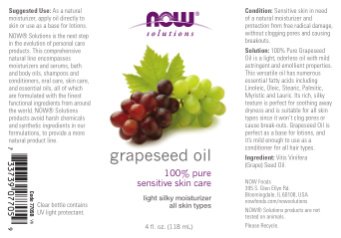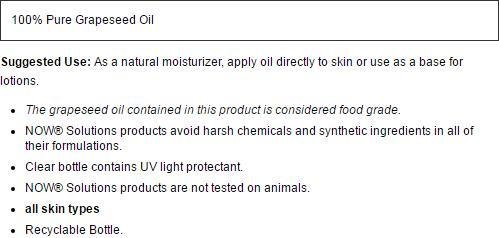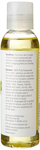 ReleaseDate : 2013-10-15 Studio : NOW Foods Publisher : NOW Foods Binding : Misc. Product Description 100% Pure Sensitive Skin CareLight Silky Moisturizer All Skin TypesCondition:Sensitive skin in need of an all natural moisturizer and protection from premature aging, without clogging pores and causing breakouts.Solution: 100% Pure Grapeseed Oil is a light, odorless oil with mild astringent and emollient properties. This versatile oil contains numerous essential fatty acids including Linoleic, Oleic, Stearic, Palmitic, Myristic and Lauric. Its rich, silky texture is perfect for soothing away dryness and irritation and is suitable for all skin types since it won't clog pores or cause break-outs. Grapeseed Oil is perfect as a base for lotions, and it's mild enough to use as a conditioner for all hair types. 0