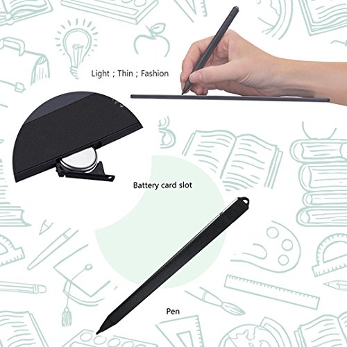 HANDY LITTLE TOOL.The writing area of the drawing pen tablet is 8.5", and the thickness is ?". Just put it in your purse or pocket when you leave home, and you will always be able to take down valuable information.The paperless notepad is an invaluable gadget for all who care about our planet. Saving tons of paper, it doesn't contain any harmful chemical components.