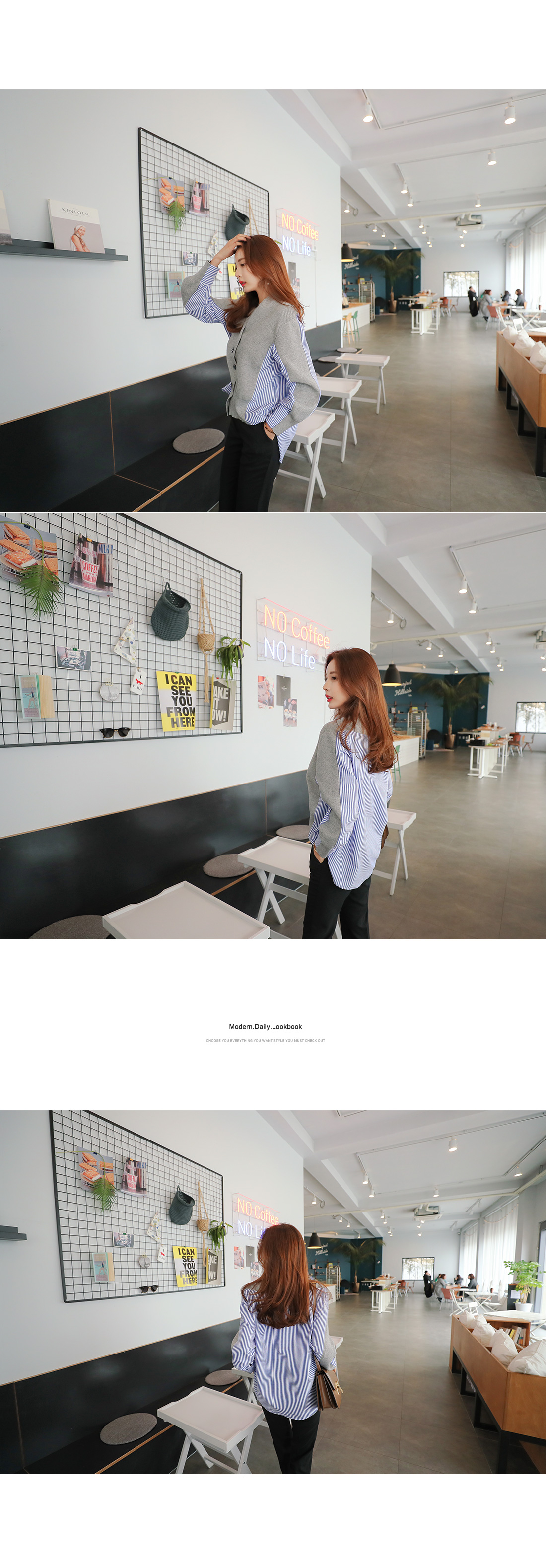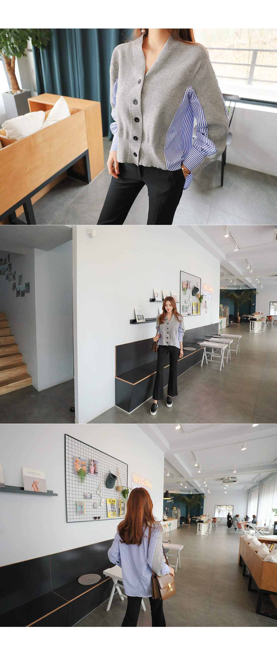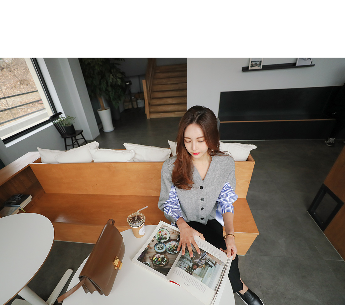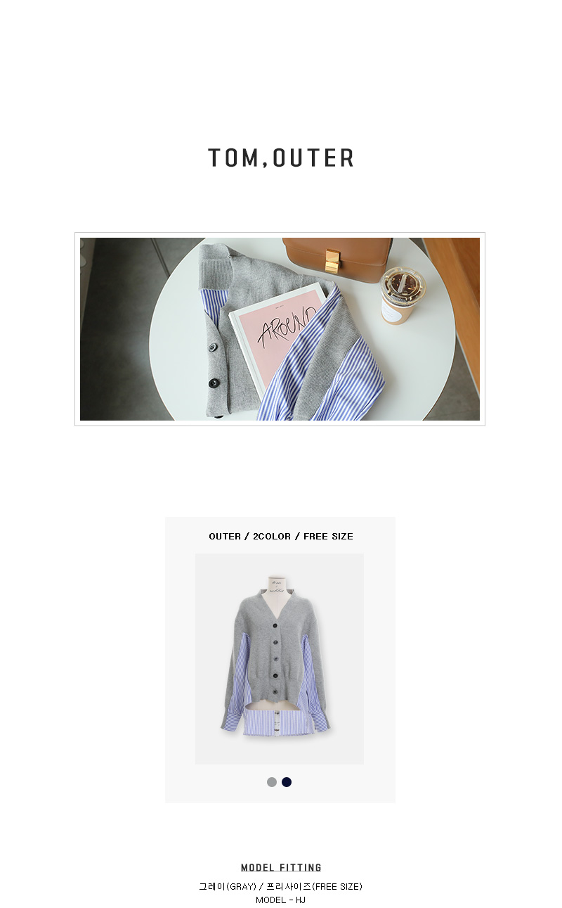 유니크한 분위기로 매칭하기 좋은 가디건 소개 해 드릴게요.적당한 두께감으로 간절기 시즌에 툭 걸치기 좋은데요!깊은 브이네크라인으로 답답함을 덜어주고드롭된 어깨와 루즈한 핏감으로 여리여리한 실루엣을 연출해 준답니다.언발로 연출되는 기장감과앞부분은 니트 가디건 으로 되어있으며 뒷부분은 셔츠처럼 연출되는 스트라이프 패턴 이 연결되어스타일리쉬한 룩으로 연출해드릴 가디건이에요.포인트룩을 완성시켜 드리는 아이템으로 추천해 드릴게요.별다른 포켓없이 심플하게 제작 되었으며오픈 클로징은 프론트 버튼으로 도와 드릴게요.그레이,네이비 두가지 컬러 준비했으며모델이 착용한 컬러는 그레이 입니다.