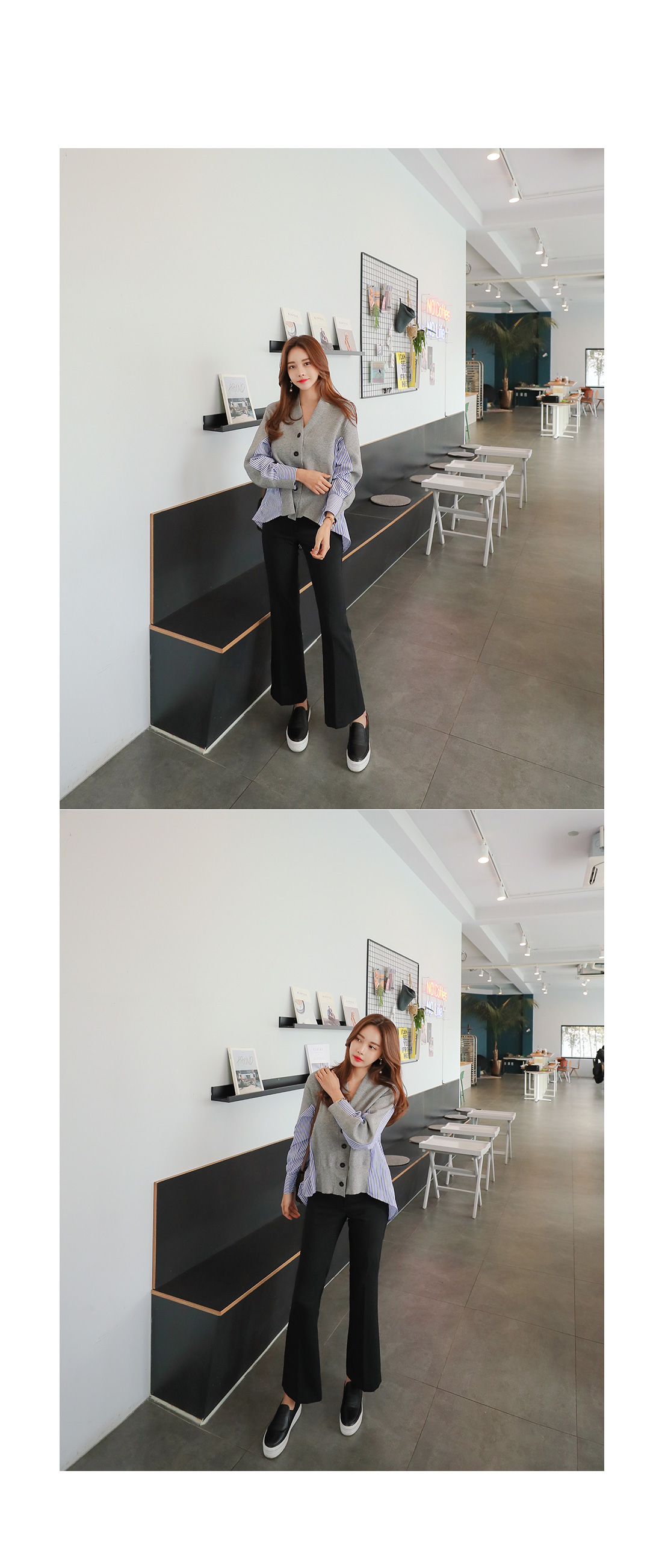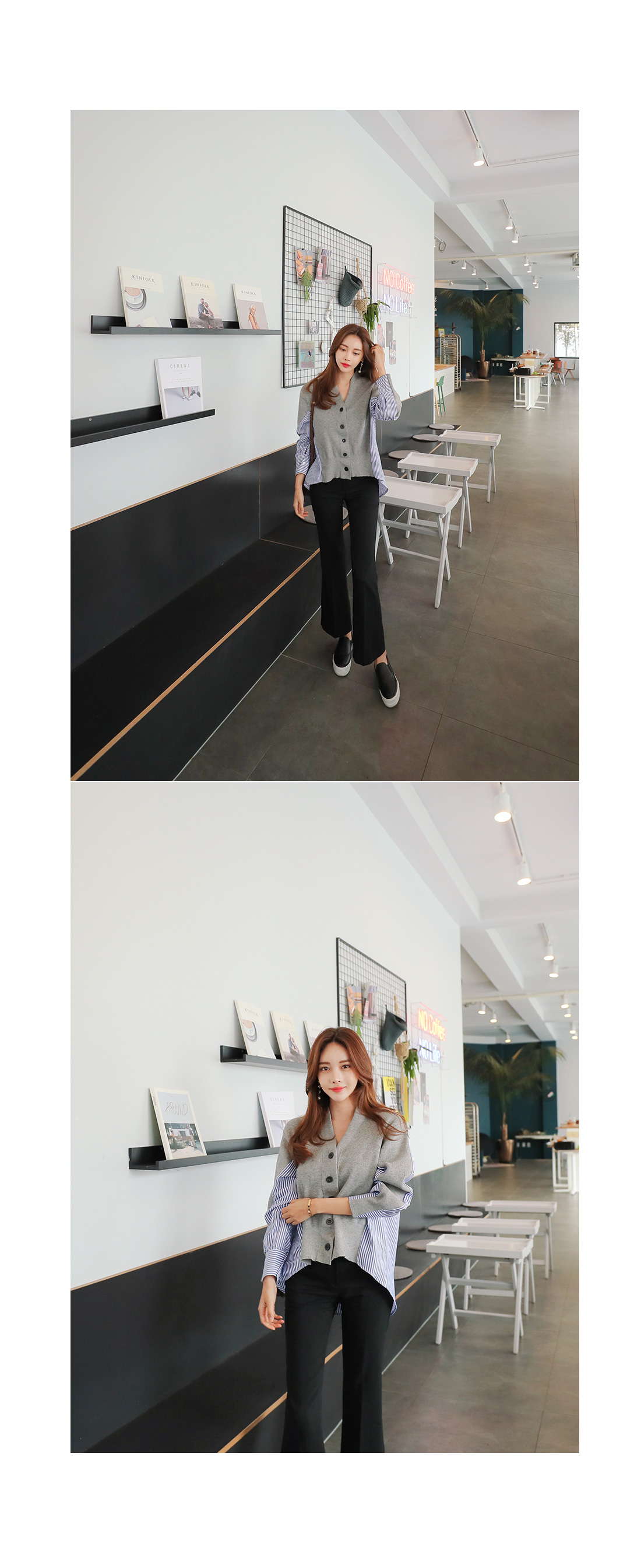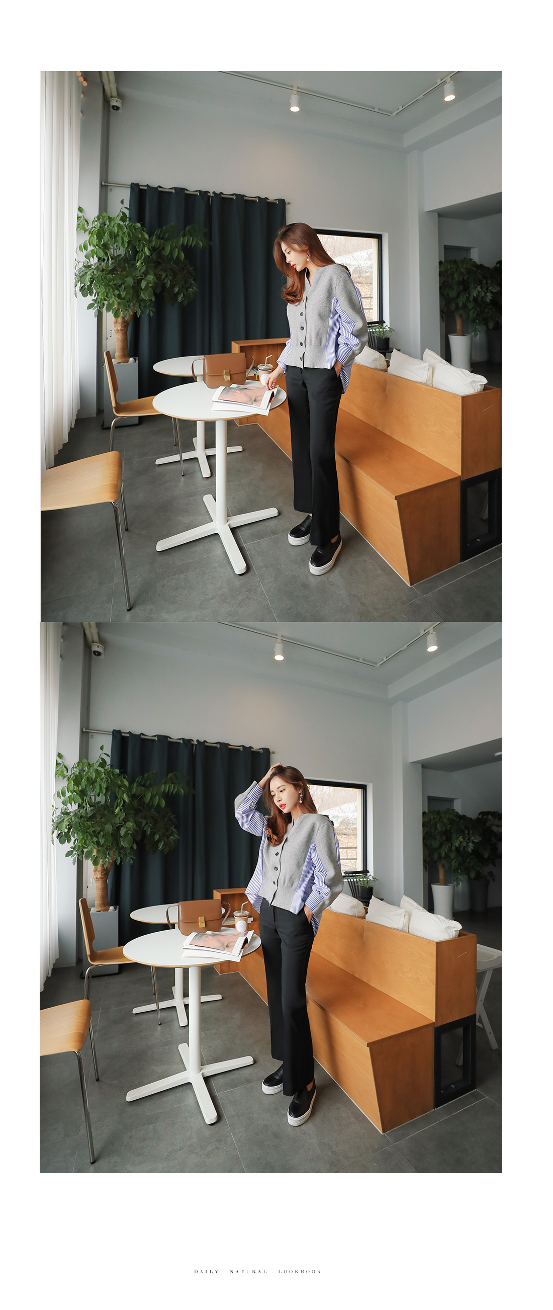 유니크한 분위기로 매칭하기 좋은 가디건 소개 해 드릴게요.적당한 두께감으로 간절기 시즌에 툭 걸치기 좋은데요!깊은 브이네크라인으로 답답함을 덜어주고드롭된 어깨와 루즈한 핏감으로 여리여리한 실루엣을 연출해 준답니다.언발로 연출되는 기장감과앞부분은 니트 가디건 으로 되어있으며 뒷부분은 셔츠처럼 연출되는 스트라이프 패턴 이 연결되어스타일리쉬한 룩으로 연출해드릴 가디건이에요.포인트룩을 완성시켜 드리는 아이템으로 추천해 드릴게요.별다른 포켓없이 심플하게 제작 되었으며오픈 클로징은 프론트 버튼으로 도와 드릴게요.그레이,네이비 두가지 컬러 준비했으며모델이 착용한 컬러는 그레이 입니다.