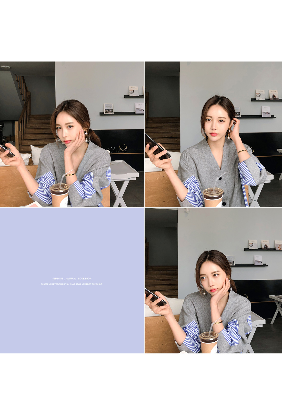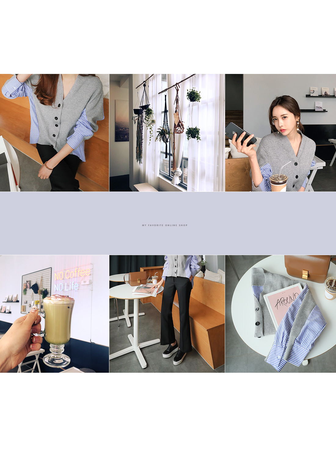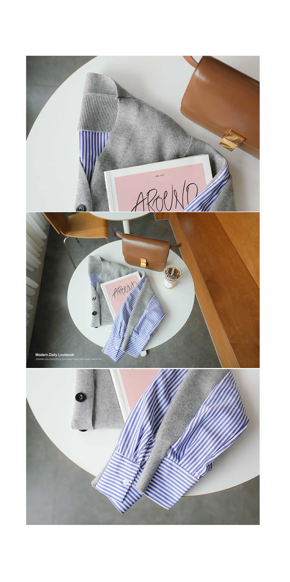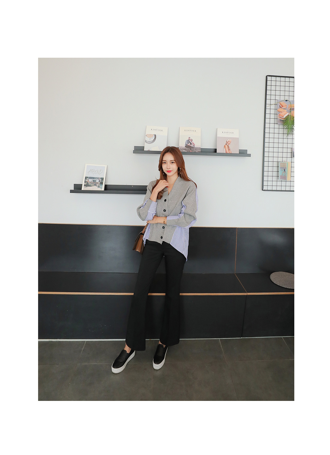 유니크한 분위기로 매칭하기 좋은 가디건 소개 해 드릴게요.적당한 두께감으로 간절기 시즌에 툭 걸치기 좋은데요!깊은 브이네크라인으로 답답함을 덜어주고드롭된 어깨와 루즈한 핏감으로 여리여리한 실루엣을 연출해 준답니다.언발로 연출되는 기장감과앞부분은 니트 가디건 으로 되어있으며 뒷부분은 셔츠처럼 연출되는 스트라이프 패턴 이 연결되어스타일리쉬한 룩으로 연출해드릴 가디건이에요.포인트룩을 완성시켜 드리는 아이템으로 추천해 드릴게요.별다른 포켓없이 심플하게 제작 되었으며오픈 클로징은 프론트 버튼으로 도와 드릴게요.그레이,네이비 두가지 컬러 준비했으며모델이 착용한 컬러는 그레이 입니다.