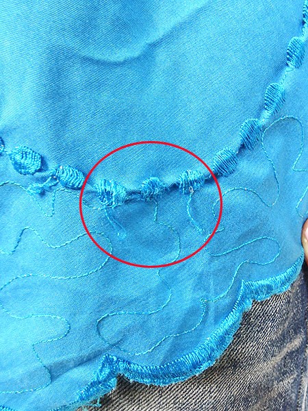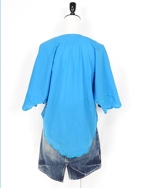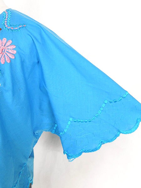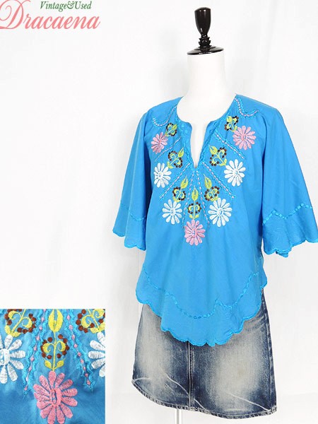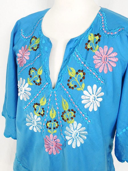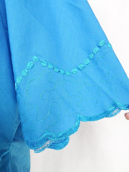Ladies ブランド- カラー水色ベース メール便不可 コンディション★★★ 素材- 表記サイズ- スタッフコメントタグなし、サイズ、素材表記なし。前刺繍下付近、後真ん中、右脇付近にシミあり。前裾など刺繍全体にホツレのダメージあり。 実寸サイズ 着丈 前59・後64 cm 身幅 56 cm 袖丈 41 cm ラグラン袖の為、襟元から袖先までの計測 ※ウエスト・ヒップ以外は平置き採寸